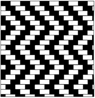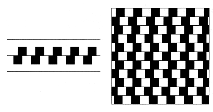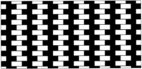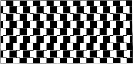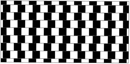 The illusion came to the attention of vision scientists in the early 1970's, when it was discovered on the wall of a cafe in Bristol, England. In 1979 Richard L Gregory and Priscilla Heard of the University of Bristol reported the first detailed study of the illusion. They related it to a much older illusion, known as the Munsterberg figure for the psychologist Hugo Munsterberg, who wrote about it in 1897. In the Munsterberg version too the top and bottom edges of individual tiles appear to tilt and the direction of tilt alternates from row to row, but the convergence is weaker. The white regions in particular are noticeable, seeming to flare vertically at one end. In both figures the tilt is an illusion: neither has any tilted elements. You can eliminate the illusion of tilt by sighting almost along the plane of the page. (You may see the accompanying illusions better if you slip a sheet of dark paper under the page to mask the printing on the other side.) Gregory and Heard, and others after them, noticed that the cafe-wall illusion is pronounced when the black and white tiles contrast sharply in brightness and the layer of mortar is narrow and of intermediate brightness. When the mortar is just as bright as the white regions, the illusion is weaker or even missing; if it is even brighter, the illusion is certain not to appear. When the mortar is just as dark as the black regions, the arrangement produces the Munsterberg illusion, with its weaker convergence; if it is even darker, there is no convergence. The tiles can be colored instead of black and white, but unless the colors contrast in brightness, the illusion is lost. Identical tiles must be staggered in the array, but the illusion does not appear if they are offset so precisely that they form a chessboard.