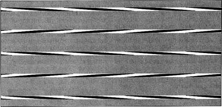 Gregory and Heard likened the array to certain patterns invented by James Fraser in the early part of this century. Fraser showed how a narrow row of slightly tilted bright and dark lines gives the illusion of tilt to the row itself. The illusion is called the twisted-cord effect because each row of lines looks something like two cords spiraling around each other. The twisted-cord effect has never been satisfactorily explained. It probably has to do with the fact that the visual system's detectors responsible for determining small-scale (or "local") orientations may influence the perception of large-scale (or "global") orientations. The influence seems to be stronger when many identical, or only slightly different, locally tilted elements are viewed. Is the tilt perceived in the cafe-wall illusion due to that kind of control of global orientation by local orientations? If it is, what are the locally tilted elements? The offset of the black and white tiles in adjacent rows might seem to serve the purpose, but the tiles are too large-and besides, such an explanation does not account for the requirement that the mortar supply a particular degree of contrast. For a long time investigators tried to identify some local tilt that could set up the global convergence of the rows. Gregory and Heard suggested that the local tilt is generated when the visual system locates the borders of a mortar line. To counteract the incessant slight eye movements that shift borders over the retina, some mechanism must lock in the positions of the borders so that the pattern appears to be stationary. Where the mortar separates tiles of the same color (either white or black), the locking mechanism fixes the borders properly. But where the mortar separates contrasting tiles and when the mortar is intermediate in contrast, the locking mechanism may be less accurate, with the result that the borders are displaced slightly. Along the length of a mortar line the visual system then senses a periodic variation in just where the borders of the mortar are, and the line looks like a twisted-cord array.