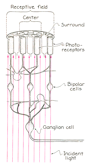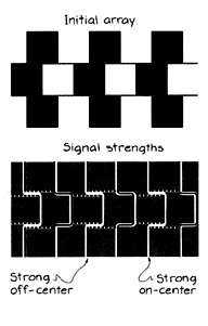 Marr argued that the early stages in the visual pathway construct a "raw primal sketch" of the reality being viewed. The sketch lacks the richness of the actual scene but has blobs, bars, terminations and segments of edges that roughly map real objects. To construct the sketch, the early visual processing by the retina and the brain identifies the sharp changes in brightness that correspond to edges. The processing begins in the retina when photoreceptors absorb photons and then send signals through bipolar cells to ganglion cells [left]. Each ganglion cell responds to a particular set of photoreceptors that are spread over a small circle, the cell's receptive field. (The illustration shows only a few of the photoreceptors.) The field is partitioned into a center and a surround that respond antagonistically to determine the net response of the cell when the field is illuminated. The strength of a signal from a ganglion cell is the rate at which it fires impulses deeper into the visual system. An unilluminated cell fires slowly, at its "resting rate." Suppose only the center photoreceptors are illuminated. One type of cell, called an on-center cell, increases its firing rate while other type, called an off-center cell, turns off. If only the surround is illuminated, the changes are just the opposite: an on-center cell turns off while an off-center cell fires faster than its resting rate. If both the center and the surround of either type of cell are illuminated equally, the cell may fire just a little more frequently than its resting rate.