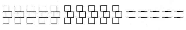 There are several variations of the Munsterberg illusion; two, published in 1978 by R H. Day of Monash University in Australia, are shown at the left above. The first one is a stripped-down version of the illusion, in which the middle line appears to tilt with respect to the top and bottom lines, which are actually parallel to it. In the second version the offset of the tiles varies | from row to row. Day also published an older array, seen at the right above, that produces what is called the kindergarten illusion. He added a note about an unpublished observation made by Gregory, who pointed out that although the kindergarten array resembles the Munsterberg array, when the two are constructed with equally bright colored tiles the kindergarten array retains some sense of convergence, whereas the Munsterberg array does not. Perhaps some other mechanism plays a role in the powerful kindergarten illusion. Another illusion of convergence was published in 1980 by Steve P. Taylor and J. Margaret Woodhouse of Cardiff, Wales [see illustration below]. When the same line serves as the border of two adjacent square outlines, no illusion appears (left), but when adjacent borders are formed by two distinct lines, there is a sense of convergence (middle). A stripped-down version is also shown (right); the array resembles a twisted-cord array even though there are no explicitly tilted elements. I find that these bare-bones designs exhibit tilt (with respect to long, freestanding parallel lines) even if they are arranged in a column or placed on a page at random. In 1985 Paola Bressan of the University of Padua demonstrated that the illusion of convergence disappears if the lines in the stripped-down version are made too thin or too thick.