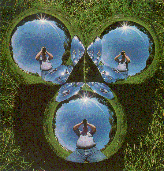 In 1972 Michael V. Berry of the University of Bristol published a study about reflections from such spheres as a Christmas-tree bauble, a steel ball from a bearing and a certain type of lawn decoration. As it happens, Berry is the author of an article-on a different subject-in this issue of Scientfic American [see "The Geometric Phase," I page 46]. Each sphere serves as a convex reflector, yielding miniature and distorted images that seem to lie within the sphere. A larger ball, such as one of the-lawn decorations, works better, because the images it yields are larger and more distinguishable. Within the sphere one sees a world that is more bizarre even than Lewis Carroll's looking-glass world. If you place a large ball in the center of the lawn and look down on it, the world appears to lie within the ball's circular cross section, which I shall call the image plane. In it your eyes lie at the center and your head is surrounded by the sky. The edge of the lawn (effectively the horizon) forms a circle within the image, and trees that border the lawn stretch toward the center of the image. Tall buildings also stretch toward the center, but they are weirdly distorted with wide bases and narrow tops. Your own image is also warped: your feet seem too large and your body thins grotesquely toward your head like that of a cartoon character. The grass of the lawn rings the edge of the image plane.