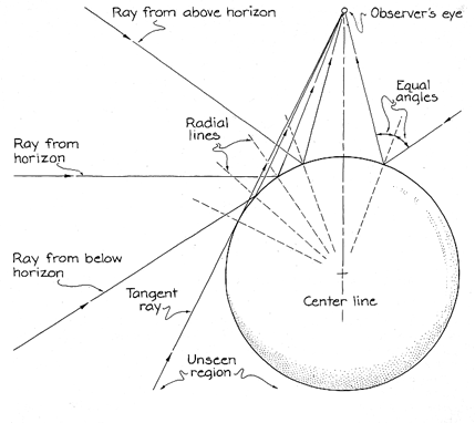 The images you see are due, of course, to the reflection of light rays by the ball [see below right]. A ray that originates from h your eyes reflects back to you from the top of the ball; the ray travels down what I call the center line and then back up it. That is why the image of your eyes will always be at the center of the image plane. Rays that originate from other objects reflect and then travel to you at some angle to the center line. Berry pointed out that the extreme case is a ray that barely skims the side of the ball and is deflected negligibly by the reflection. Since it is approximately tangent to the ball, I shall call it a tangent ray. It marks the boundary of what you h can see. Any point on the ground nearer to the ball than the origin of the tangent ray is hidden from view. Everything else in your surroundings has an image in the ball, except of course where your body happens to block rays from reaching the ball. One of the rays you see originates at what is effectively the horizon, and it approaches the ball along a horizontal path. Rays that reflect higher on the ball than the horizontal ray approach the ball along a path that is angled downward, and they are said to originate above the horizon. Rays that reflect to you from points on the ball lower than the horizontal ray approach the ball from a path that is angled upward, and they are said to originate below the horizon. (This last set of rays is important in the discussion that follows. Notice that these images of the ground lie above the middle of the ball and between the points where the horizon and tangent rays reflect.)