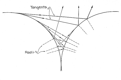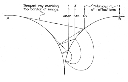 Wondering if the reflections could be catalogued better, I studied the tangent rays from A, starting with one that leaves high on the ball and is reflected by B toward the right [see illustration above]. Imagine what happens if you watch a videotape in which the initial ray from A is slowly angled down along the side of A, always staying tangent to the ball. During the descent the resulting ray reflected by B swings leftward through the vertical and then toward A, and the reflection sequence is AB. Stop the tape when the final ray, like the initial ray, is tangential to A and note that at that moment the light happens to be reflected along a radial line through B. Such a reflection sends the light back along its previous path, so that it reflects tangentially from A again. When you restart the tape, the light reflects three times in the sequence ABA, and the final ray begins to swing rightward through the vertical and then toward B. When it reaches B, again stop the tape and examine the light path. Note that the lowest segment of the path is horizontal. This feature indicates that the ray's path is symmetrical left and right. Since the initial ray is tangent to A, the final ray is tangent to B. Continue the tape. There are now four reflections in the sequence of ABAB, and the final ray swings leftward W through the vertical and back to A. Stop the tape when it reaches A. Just then the lowest segment of the light path reflects along a line that is radial to A, and the light is sent back along its previous path and so ends up being tangential to A again.
