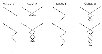 This much is enough to predict the rest of the taped sequence. An extra reflection is added whenever the final ray becomes tangential to one of the balls. The shape of the light path at that moment can fall into one of three classes that are characterized by the angle of inclination of the lowest segment of the path. In describing the classes I shall call the ball from which the light initially reflects the "original ball" and the other ball the "opposite ball." In class 1 the lowest segment is radial to the opposite ball and the final ray is tangential to the original ball. In class 2 the lowest segment is radial to the original ball. In class 3 the lowest segment is horizontal, which gives left-right symmetry to the path, so that the final ray is tangential to the opposite ball. If you replay the tape and note the path class when an extra reflection begins, you will find a sequence of 1, 3, 2, 3, 1, 3, 2 and so on. Every other time the lowest segment is horizontal and the path is symmetrical. At intermediate times the lowest segment alternates, slanting first toward one ball and then toward the other. The paths underlying long sequences of reflections can be understood by sketching them in a simplified way that still retains the general shape of each path -see upper illustration at left]. After this analysis I moved the third ball back into place. Where any two balls touched I saw a series of images that resembled the series I had seen in just two balls. The difference was that within any one image of a ball there were now two images, one larger than the other. Inside each of them were two more images, one larger than the other. If you ignore details of the sky in the images and concentrate only on their shape, the array is fractal, reproducing the same pattern on an ever decreasing scale.