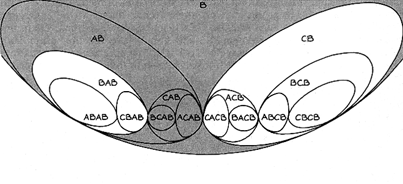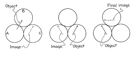 In order to identify which ball gives rise to which image, I applied a common technique for multiple reflections. When light rays from an object reflect at a surface such as a flat mirror or a shiny ball, an image is said to be created inside the surface. If the rays then reflect from a second surface, the image inside the first surface serves as the object for the second reflection and an image appears inside the second surface. In a sequence of multiple reflections you can start with the original object and go through the reflections by steps in this way. Each time an image serves as an object for the next reflection, until an observer intercepts the rays and sees the final image. Figure 6 demonstrates the technique for a sequence in which rays from the sky are first reflected by A and Band then in the order CAB before they are seen on the side of B. The first reflections are not shown, but the combined images of the sky that are produced in A and B are represented by a line joining A and B and having a dot at the B end. In the first part of the illustration the next step in the sequence is indicated. The images in A and B act as objects, and images of them appear in C. The second part of the illustration shows the next step: the images in C act as objects, and new images appear in A. In the third part of the illustration those images act as objects and the final images appear in B, which you see on the side of that ball. Note that with this technique you can determine where the sky image that is first reflected by B ends up. It is to the left of the sky image first reflected by A. The reflection sequences in the illustration are ACAB and BCAB. After repeating the analysis for other possible sequences, I constructed a map of many of the images seen in B [see upper illustration at left]. Observe that they form levels in the map (and on the ball) and that the ones on a lower level (lower on the ball) are smaller than the ones on a higher level (higher on the ball). I shall work downward through the shaded ovals in the map until I reach the images I have just described. The top level is labeled B and corresponds to the top of the ball, where light rays from the sky are reflected directly to you. On the left side of the next level there is an image of the sky that is first reflected by A. It surrounds the point where A and B touch and is part of the series seen when only A and B are present. Within that image are two more images. The one on the right is an image in which the rays undergo a reflection sequence CAB. Within that image are two more images that correspond to the sequences BCAB (on the left) and ACAB (on the right). These are the sequences that were shown in the preceding illustration. You might like to add more layers to the map. The images get smaller and the layers become more crowded. In my