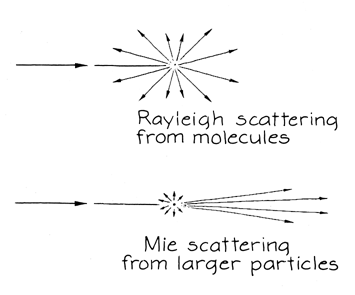 They pointed out that the reason the color is instead usually a rich red is that the light normally scatters not only from molecules but also from very small particles and aerosols in the atmosphere. When you look in a direction close h to the sun at any time of day, you intercept some of its bright light scattered forward by those same small particles and aerosols, and so that region of the sky is brighter than it would be if the particles were absent. When the sun is high, its surround is bright white. When it is low, on the other hand, the light reaching the particles has already been reddened by Rayleigh scattering and the surround is bright red. The greater the density of the particles, the brighter the surround and the sharper the circumference of the setting sun. I have been assuming that the particles and aerosols alluded to so far are smaller than about .1 micron, and that as a result they scatter light by the Rayleigh mechanism just as molecules do. Particles that are somewhat larger than .1 micron scatter light by a much more complex mechanism, which is called Mie scattering after Gustav Mie, the German physicist who developed a theoretical model for such scattering at the beginning of this century. Mie scattering by a sizable particle is actually a form of diffraction, with most of the light being sent forward in a narrow cone. Red light is spread over a wider cone than blue light, and so the continuing beam becomes bluer. (In h simple diffraction the light waves that strike a particle spread out and also travel around the particle and into its "shadow region." In Mie scattering the behavior of the light is harder to interpret, and I shall not consider its details.)