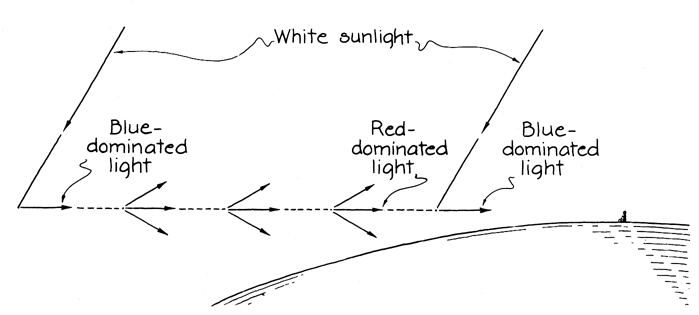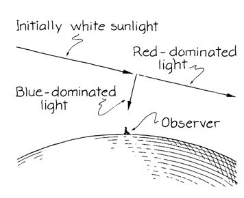 Each color component in the sunlight is scattered from the molecule in all directions but not with uniform intensity. The brightest scatter is in the forward direction (as if the light passed directly through the molecule) and in the backward direction (back toward the sun). Light scattered at a right angle to the sunlight's initial path is only half as bright. All the colors scatter in this pattern, but the intensity scattered in any particular direction is different for each color. Rayleigh found that the intensity depends on the inverse fourth power of the wavelength. Therefore short-wave-length light (say blue) is more strongly scattered than, say, red light, which has a long wavelength. Since the ratio of their wavelengths is about 1.68, the blue scattered light is 1.684 (or about eight) times as bright as the red scattered light. Suppose you intercept the light that is scattered to the side at an angle of about 90 degrees to the initial direction of the sunlight. If you could perceive the light from a single molecule, it would be bluish, because the blue end of the spectrum would be brightest. The picture is more realistic when abundant molecules scatter light to you, so that the light and its color are perceptible. That is the case when you look up at an area of the sky away from the sun. All the molecules along your line of sight scatter light to you that is dominated in intensity by blue; that part of the sky appears to be bluish-not pure blue, because you also intercept the other, fainter colors. The fact that the blue end of the spectrum is strongly scattered out of the initial beam of light means the beam continuing through the atmosphere gradually becomes dominated by the red end of the spectrum. If you look toward the sun when it is high, the light reaching you has traversed too little of the atmosphere to be appreciably reddened. When the sun is low and the sunlight takes a longer path through the atmosphere to reach you, the light is noticeably reddened, and so sunsets are dominated by the red end of the spectrum.