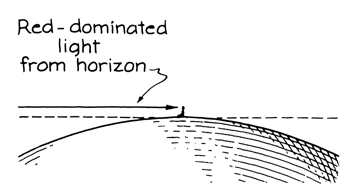 In daytime the blue of the sky dulls toward the horizon, and in a band of about five degrees from the horizon the sky is often white. Since the air molecules along a line of sight to the horizon must, like any others, scatter light by the Rayleigh mechanism, what can have happened to the blue? Bohren and Fraser explained that the lack of color is due to the long path through the atmosphere taken by light reaching you when you look toward the horizon rather than looking up. The added distance means the light scatters many more times before it reaches you. Some light scatters from molecules that are not very distant [see illustration directly below]. From them you receive light that is dominated by the blue. Much more distant molecules also scatter blue-dominated light in your direction, but your distance from those molecules means that the light undergoes repeated scattering before it reaches you. In each scattering event the light scattered toward you is light scattered in the forward direction, so that its blue component is weakened; after many scattering events that light ends up being dominated by the red half of the spectrum. The result is that you receive mostly the blue half of the spectrum from nearer molecules and mostly the red half from more distant molecules. The combination is white, and that is the color of the sky in the direction of the horizon. The same effects explain the colors of dark mountains seen on a clear day. If the mountains are not too distant, their image is bluish, because blue-dominated light is scattered by the air molecules between you and the mountains. Somewhat more distant mountains may be even bluer, but those that are very far off are white-just as the horizon is. According to Bohren and Fraser, the light from a setting sun would actually be orange (between red and yellow) instead of red if it scattered only from air molecules along its way to you.