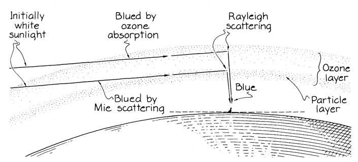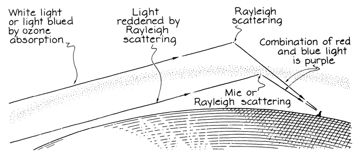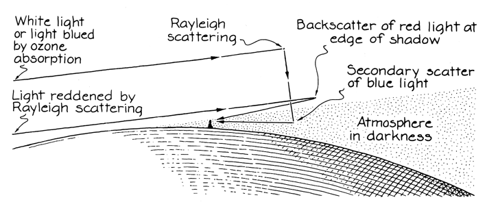 During twilight on a clear evening the zenith (the sky directly overhead) becomes bluer than it is during the day. The extra blueness seems strange, considering that the horizon near the sun may be quite red. Several explanations for the bluing have been given, the likeliest of which involves the ozone layer. When light from the sun takes a slanted path through the layer at sunset, the ozone's absorption of the red end of the spectrum leaves the beam dominated by the blue end in spite of the Rayleigh scattering the beam encounters along the way. The beam becomes even more dominated by blue light if it also slants through a layer of particles large enough to introduce Mie scattering. After the light has been blued by either mechanism or both of them, some of it then scatters to you from the zenith by the Rayleigh mechanism, and you see a purer blue coming from there than you do in the daytime. Just after sunset the shadow of the earth begins to rise from the eastern horizon. The border of the shadow is usually red or rosy purple. The color is due to light that has been reddened by Rayleigh scattering during its long passage through the lower reaches of the atmosphere. Near where you see the top "edge" of the shadow some of the light undergoes Rayleigh scattering and returns toward you. When you intercept the light, you perceive red at the top edge. Below the edge the upper part of the shadow may be a faint blue. The blue tint is probably due to sunlight that travels through higher, less dense parts of the atmosphere, where the blue component of the beam is not weakened as much as it is in a beam that passes lower in the atmosphere, which encounters more air molecules. The light may actually be appreciably blued if it passes along a slanted path through the ozone layer or through a particle layer that forces Mie scattering. Near the earth's shadow some of the light undergoes Rayleigh scattering and travels into the shadow, where it again undergoes Rayleigh scattering before it heads toward you. Since this scheme involves multiple scatters, the blue light you finally intercept from the shadow region is dim. It is perceptible because you see it against the dark shadow of the earth. About 10 minutes after the sun has set a purple patch occasionally develops above it somewhere between 30 and 75 degrees from the zenith. The patch, which is often called the "purple light," seems to depend on the presence of a layer of particles at an altitude of from 16 to 20 kilometers, in the lower part of the ozone layer. The particles might be dust from a desert or fine ash from volcanic eruptions or large forest fires. In 1967 Aden B. Meinel and Marjorie Pettit Meinel of the University of Arizona pointed out that such a layer might be formed not by particles but by another product of volcanic eruptions. If an eruption emits a large amount of sulfur dioxide, when the gas mixes up to the base of the ozone layer, it interacts with the ozone to produce sulfates. When the sulfates precipitate onto condensation nuclei, a Mie-scattering aerosol is formed. In their beautiful book Sunsets, Twilights, and Evening Skies the Meinels have suggested that the purple patch is the product of very red light and very blue light that is scattered from different regions of the sky. The red component comes from sunlight that has skirted the earth, passing through so much atmosphere that Rayleigh scattering has made the light red. Some of this light scatters to you from the particle layer-presumably by Mie scattering if the particles are large enough and by Rayleigh scattering if they are smaller; in any case you receive extra red light because of the presence of the particles. The blue component comes from sunlight that passes through higher parts of the atmosphere and so does not redden as much. (I might add that since the light passes through the ozone layer along a slanted path, it may be dominated by the blue end of the spectrum because of absorption.) Some of the light undergoes Rayleigh scattering, and blue light is sent toward you. Both the red and the blue components travel along your line of sight when you view the patch, and the combination creates the impression of purple light. The reason other parts of the sky are not purple is that you receive different mixtures of colors, rather than simply red and blue, when you look toward them; they may have a variety of hues that depend on your angle of view. The colors are particularly brilliant when the particle layer is dense and extensive, as it often is after a major volcanic eruption. The 1883 explosion of Krakatau near Java produced brilliantly colored sunsets for about five years, and sunsets were colored by the 1963 explosion of Agung on Bali for about three years. A second (but much rarer) purple light, which appears in about the same part of the sky as the first one but between an hour and a half and two hours after sunset, is still not well understood. Some twilight watchers think it is caused by the same particle layer as the first purple light. If the layer is extensive, some of the light that scatters from the part of the layer well below the horizon may scatter again from the part of the layer that is in view. Provided the light is bright enough, you would then see a faint purple patch. An alternate explanation involves a second layer of particles at an altitude of from 80 to 90 kilometers, in a region of low temperature at the junction of the mesosphere and the ionosphere above it. These particles may be of terrestrial origin but are more likely from space; the earth intercepts a vast amount of comet and asteroid debris that may occasionally produce an extensive particle layer in the low-temperature region. Sunlight scattered by the layer is certainly too faint to be perceived during the day or even at early twilight, but it might be seen when most of the atmosphere in view is in the shadow of the earth and the layer is still illuminated by the sun. The increa