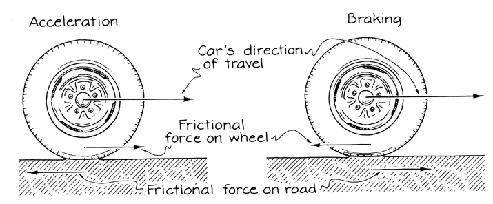 To decide the matter you must consider the frictional force on the wheels from the road. When a wheel rotates smoothly without slipping, the friction is said to be static friction. The size of the frictional force matches the force the wheel exerts parallel to the road. When the car is stationary and exerts no force parallel to the road, there is no friction on a wheel. When the car accelerates and the engine attempts to turn the wheels faster, the driving wheels then push the road toward the rear and the road pushes them forward. It is this forward force on the wheels from the road that propels the car. When the brakes retard the rotation of the wheels, the wheels push in the forward direction and experience a frictional force toward the rear, which is what slows the car. The upper limit to the force due to static friction is set by the product of the downward force on a wheel and a characteristic of the tire-road interaction called the coefficient of static friction. Normally the downward force in this equation is the amount of the car's weight supported by the wheel. The coefficient of static friction is largely a measure of the small-scale roughness of the tire and the road. A typical value for a dry asphalt road is .8. If the force on a wheel from the road exceeds the upper limit of the static friction, the wheel begins to slip, and the frictional force on the wheel is then said to be sliding friction. If the brake is applied hard enough, it almost immediately locks the wheel. The frictional force points toward the rear of the car and its magnitude is equal to the product of the downward force on the wheel and a coefficient of sliding friction. Note that although the strength of the force due to static friction can vary from zero up to some maximum amount, sliding friction is set at the size given by the product. (Actually there can be a small variation in sliding friction owing to the speed at which the wheel slips over the road and other factors.) The coefficient of sliding friction is less than the coefficient of static friction. For example, when a standard tire slides over dry asphalt, the coefficient of sliding friction may be .6. The reduction in friction when sliding begins results from several factors, but the most important one involves the heat generated by the sliding. When the road consists of bituminous materials such as asphalt, they melt and a skid mark is left. The tire may also melt. In any case the sliding produces a fluid layer between the wheel and the road that lubricates the motion and reduces the coefficient of friction. And so should you lock the wheels in an emergency braking or not? If you brake hard without locking the wheels, the