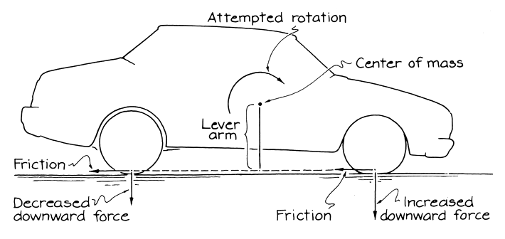 static friction on the wheels can be as large as its upper limit. If instead you lock the wheels and they begin to slide, the friction is smaller than that upper limit because of the lubrication. Since in each case it is friction that brings the car to a stop, the best decision seems to be the first one, in which case the friction is larger and the car should stop in the shortest distance. Thus state some physics textbooks. Driving experts sometimes differ with the conclusion. At least one has argued that when you are in an emergency braking situation, you surely do not have time to find the braking that maximizes the static friction while avoiding any locking of the wheels. The point is certainly correct: if you adjust and then readjust the braking, the time required must inevitably add to the stopping distance. Suppose you ignore that practical point. How then do you answer the question about braking methods? The matter was taken up in 1979 by Daniel P. Whitmire and Timothy J. Alleman, who were then at the University of Southwestern Louisiana. They pointed out that, contrary to the standard textbook argument, experiments reveal that a stop in which all four wheels are locked usually requires less distance than a stop without any sliding. Their key point is that during braking, forces due to friction create torques on the car that significantly change the downward forces on the wheels and hence the frictional force. To understand their point, consider a car that is moving forward when the brakes are applied [see illustration at right]. If none of the wheels slides, then each experiences a static frictional force toward the rear that slows the car. The forces also create torques that attempt to rotate the car vertically around its center of mass, so that the rear rides up and the front is pushed down. For each wheel the torque is equal to the product of the friction and a certain distance that is called a lever arm. To find the lever arm, mentally extend a frictional force under the car. The lever arm is a line perpendicular to the extension that passes through the car's center of mass. Since the friction is at road level, the length of a lever arm is the height of the center of mass. You can determine the direction of rotation associated with a torque by imagining that the force attempts to rotate the lever arm itself around the center of mass.