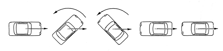 The possibility of "spinout" was investigated in 1984 by William G. Unruh of the University of British Columbia for situations in which only the front wheels or only the rear wheels begin to slide. As you may have noticed in driving emergencies, if only the front wheels lock, the car is often stable in the sense that it continues to point forward, but if only the rear wheels lock, the car is likely to spin around until it points toward the rear and travels backward down the road. To follow a simple version of Unruh's analysis (he also offered a highly refined version), consider a car that suddenly begins to spin counterclockwise [see illustration below]. Suppose that the front wheels are locked and the rear wheels are still rolling. Since the car is spinning, the rear wheels must be sliding sideways and experiencing a sliding frictional force that is parallel to the rear axle. The front wheels also experience sliding friction, but because they are locked, the forces point directly backward, opposite to the intended direction of travel. Each frictional force generates a torque that tends to rotate the car horizontally about its center of mass To evaluate the torques, take an overhead view of the car and ignore the height of the car's center of mass above the road. Then, to find the lever arms associated with the torques, extend an arrow representing each force until it intersects a perpendicular line that goes through the car's center of mass. The length of the perpendicular line is the lever arm, and the direction of the rotation caused by a torque can be inferred by imagining that the force tends to rotate the lever arm itself about the center of mass. When the front of the car has just begun to spin to the left, the approximately equal torques from the front wheels attempt rotations in opposite directions and cancel, but the torques from the rear wheels both promote a clockwise rotation that opposes the spin. Even if the car turns appreciably, so that the torque from the left front wheel increases because of a lengthened lever arm, the torques due to the friction on the rear wheels continue to dominate because of their longer lever arms, and eventually the spin is halted and then reversed until the car is again pointed in the proper direction. Hence when only the front wheels lock, any chance rotation of the car is automatically corrected by the friction on the rear wheels. Suppose instead that only the rear wheels are locked. They experience frictional forces that are directed backward, while the still rolling front wheels experience frictional forces that are parallel to the front axle [see Figure 5]. Early in the spin the torques from the rear wheels essentially cancel, because they attempt rotation in opposite directions. The torques from the front wheels do not cancel, because they both promote a counterclockwise rotation, and so the car continues to spin. As the car's misalignment increases, the torque from the right rear wheel increases because of its lengthened lever arm, but it is still no match for the combined torques from the front wheels. And so the spin goes unchecked and the car turns completely around until it is traveling down the road backward. Unruh also considered how the position of a car's center of mass influences the likelihood of such a reversal. If the engine is in the front of the car, the center of mass is forward of the car's midpoint and less weight rides on the rear wheels than on the front ones. The rear wheels are then more likely to lock first during an emergency stop, sending the car into a spin. When the engine is in the back of the car, as it was in a Volkswagen "Beetle" once owned by Unruh, the car is much stabler against spin. Then the center of mass is behind the car's midpoint and more weight rides on the rear wheels than on the front ones. The front wheels are more likely to lock first, and so any spin is quickly corrected by the friction on the rear wheels. Some drivers arrange for such stability even in a car where the engine is mounted in the front-they pack bags of sand or some other heavy objects in the back of the car. The precaution might indeed help a driver who faces the possibility of braking on an icy street where otherwise the rear wheels would easily become locked. Two initial conditions affect the possibility that a car with a front-mounted engine will spin when its rear wheels are locked. If the car is suddenly at an angle to the intended direction of travel but has no spin yet, it will begin to spin out of control if the angle is larger than some critical value. The critical value is small for most street speeds, and it gets even smaller for progressively higher speeds. If instead the car is initially pointed in the intended direction and is given some spin by, say, a nonuniform part of the road, it will continue to spin if the initial spin is larger than some small critical value. Again speed works against the driver. In most practical situations, particularly at high speed, the locking of the rear wheels is certain to send the car into an uncontrollable spin. The existence of a critical angle and a critical initial spin has to do with the fact that the frictional forces not only create torques on the car but also slow it and tend to change its direction of travel. If neither the critical angle nor the critical initial spin has been exceeded, the action of the forces actually stabilizes the car. For example, if the car is suddenly turned slightly leftward, the friction that then works on the front wheels might accelerate the car's center of mass to the left, thereby bringing its direction of travel in line with the direction in which it is pointing before the spin can build. You might be able to correct a spin by turning the front wheels toward the intended direction of travel; at least, that is what is commonly advised. If the speed is low, the scheme should work even if you turn the wheels somewhat too far and then have to tu