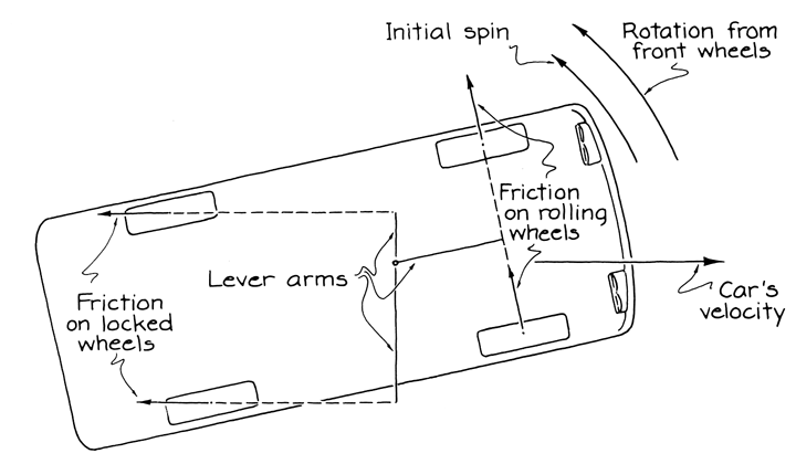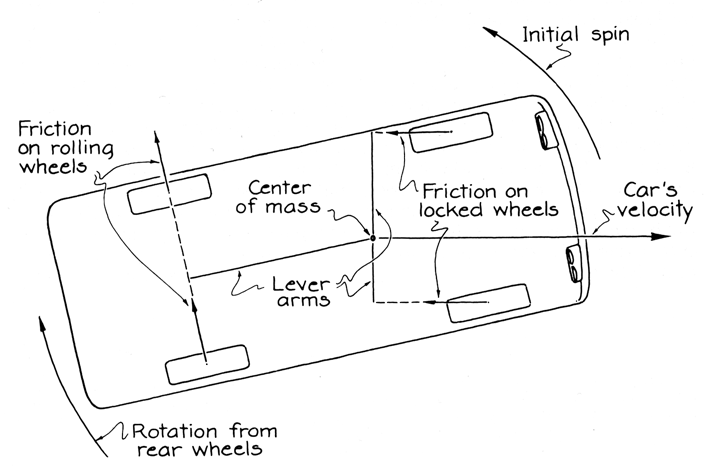 wheels begin to slide and the front wheels are on the verge of sliding. Then the combination of the maximum static friction on the front wheels (which is large because of the torques) and the sliding friction on the rear wheels stops the car in a distance that is only slightly longer than D and hence is smaller than the stopping distance for a fully sliding car. The brakes on cars are often biased to counteract the torques created by the friction: when you press down on the brake pedal, you engage the front brakes more than the rear brakes. Suppose the bias is so strong that the front wheels are put on the verge of sliding while the rear wheels are far from the sliding limit. Then the front wheels experience the maximum static friction while the rear wheels may experience only a small static friction, and again the stopping distance can be dangerously larger than D, and even larger than the distance for a fully sliding car. The situation improves if the brakes are applied hard enough so that the front wheels begin to slide and the rear wheels are put on the verge of sliding. Then the front wheels experience sliding friction while the rear wheels experience the maximum static friction, and the stopping distance is only slightly larger than D. There is one more condition to consider. The brake bias can be adjusted so that front and back wheels can be simultaneously put on the verge of sliding and all the wheels experience the maximum static friction. Only in this ideal case is the stopping distance D, as predicted by a textbook calculation. Such adjustment, however, may not be practical because it depends on the coefficient of static friction. Although the bias can be optimized for one type of road surface, it would then not be optimum for a different type of road surface with which the tires experience a different coefficient of static friction. (Here one sees the rationale for computer-controlled brake systems: the bias can be automatically adjusted for any road.) In summary, then, locking all four wheels and sliding may be the best strategy in some emergency stops if the idea is to minimize the stopping distance. Its advantage is greatest if the torques on a particular car tend to put the rear wheels on the verge of sliding before the front wheels reach that point. The strategy does have one serious flaw, however: if the car is fully sliding, you have virtually no control over where it is headed, because of the lubricating fluid between the tire and the road. If the car happens to be turning when it begins to slide, you might quickly spin out of your lane of traffic. Spin can also be initiated if the wheels do not experience identical sliding friction or if the road is tilted or crowned, as it often is to improve drainage. A stop with the car both sliding and spinning might prove to be even more dangerous than a controlled stop, even if the controlled stop requires a greater distance.