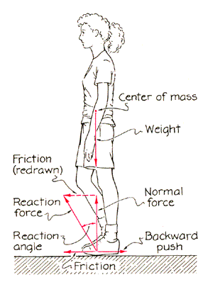 Darlington College of Technology and W. Johnson of the University of Manchester Institute of Science and Technology. The techniques rely on the friction between the climber and the rock. Friction, of course, is the force that opposes the sliding of one surface over another, such as a climber's shoe over rock. A simplified | explanation of friction involves the h small-scale roughness of the surfaces. Even if two surfaces, such as flat rock k and the sole of a shoe, appear to be smooth, they are likely to be covered with tiny hills and valleys. When a force tries to slide the surfaces over each other, the hills on one surface catch on the hills and in the valleys of the opposite surface. The collective resistance to the sliding motion is the friction. Before I get to the tricky cases of rock climbing explored by Hudson and Johnson, I shall examine the forces involved in some common situations of standing and walking. When you stand upright on a floor, two forces operate on you: your weight pulls down, and the floor pushes up just as much. The forces can be represented by vectors that indicate size and direction [see Figure 1]. The weight vector is assigned to the center of mass, which is approximately behind the navel when you are upright. The force from the floor is called the normal force, "normal" indicating that the force is perpendicular to the support surface-in this case the floor. If you begin to step forward with one foot, your leg muscles push backward on the other foot, which experiences friction that must exactly counter the push if it is not to slip. The friction is represented by a vector parallel to the floor. If you push harder and the trailing foot still does not move, the friction must then be larger and, again, an exact match to the push. If you push too hard, so that the push exceeds some upper limit on the friction, the hills will yield and your trailing foot will slip. The upper limit on the friction is determined by the product of the normal force and the "coefficient of friction," a measure of the roughness of the sole and the floor. Because the normal force equals your weight, the upper limit on the friction depends primarily on the coefficient of friction. When the coefficient is large, as it is on dry concrete, the upper limit is also large; you may be able to push quite hard without slipping. When the coefficient is small, as it is on slippery ice, even a small push makes the trailing foot slide.
