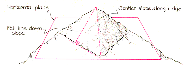 If the pitch is moderate and you push backward on one foot in order to step up the ramp with the other foot, the push is directed down the ramp and requires that the friction on the trailing foot increase. This tilts the reaction force forward from the vertical and increases the reaction angle [see Figure 3]. The stability of the foot can be described in terms of either the friction or the reaction angle. The foot is stable if the friction does not exceed its upper limit or, equivalently, if the reaction angle does not exceed its critical value. If you carelessly push too hard, your foot can slip even if the pitch is only moderate. Armed with these examples, I now return to the specific questions about rock climbing. First was the question of whether to scale a tilted slab directly or along its juncture with another, similarly tilted slab. On either route 1t you always need to keep the reaction angle below its critical value, which is set by the coefficient of friction between your shoes and the rock. The danger of slipping is greatest when you step up the slope and push backward on the trailing foot. To be safe you should choose the route with the least pitch, even when you might be able to stand stably on another route with a steeper grade. The least pitch is along the ridgelike juncture. One way to see this is to run a line straight down a slab so that it is the leg of a right triangle, the hypotenuse of which is the ridgelike juncture [see Figure 4]. The leg, being shorter than the hypotenuse, must have the steeper pitch.
