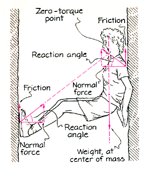 To check Hudson and Johnson's conclusion I went through the following mental exercise. First, how does the friction on the feet depend on where the feet are placed? Consider the climber's weight and the reaction forces on the feet and the shoulders [right]. Again, stability requires that extensions of the forces pass through a zero-torque point. Imagine what happens to the reaction force on the feet if they are moved and the normal force is unchanged. If the feet move downward the friction on them must increase if the reaction force is still to extend up toward a zero-torque point. If the feet move upward the converse happens. Also, because the sum of the forces must balance the climber's weight, any change in the friction at the feet must be met by an opposite change in the friction at the shoulders. Suppose the climber places the feet at some low but stable point on the chimney and relaxes the push against the rock until the feet are on the verge of slipping. The reaction angle at the feet is then at its critical value. If the climber were to move the feet downward, the friction on the feet would increase; to keep the reaction angle from exceeding its critical value, the normal force would have to be increased. And so moving the feet down is not a good idea. What about moving the feet upward? The friction on the feet then decreases, and the reaction angle can be kept at its critical value while the normal force is safely decreased. Moving the feet up may allow the climber to relax somewhat, but because of changes in the forces at the shoulders, the feet cannot be lifted too high. As the feet are raised and the climber relaxes, the friction at the shoulders edges toward its upper limit. The normal force and the push by the climber can be minimized when the friction at the shoulders reaches the upper limit. If the feet are lifted any higher, the normal force and push must increase.