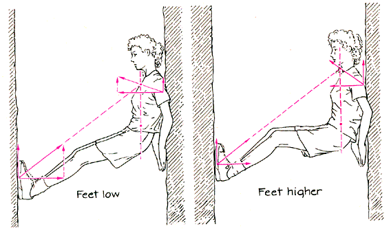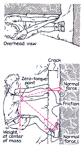 To move up a chimney a climber must push downward on one foot, but the push requires additional friction on the foot and additional normal force if the foot is not to slip. To be safe the climber should prepare for an upward move by first raising one foot and bracing it against the wall. If the lower foot happens to slip during the ascent, support by the higher foot can prevent a fall. The same technique can make a lie-back safer: when the climber must push downward on a foot to raise the body, the other foot should be poised higher in case it must take over if the lower foot slips. A lie-back is tiring primarily because of the great tension on the arms [see illustration left]. If the climber wants to rest and minimize the tension, should the feet be high or low? You can explore the question by balancing forces and requiring that the reaction forces and weight extend through a zero-torque point. In their own determination of the best location for the feet, Hudson and Johnson made several simplications. (They assumed that the friction on the hands is small enough to ignore and that the friction on the feet fully supports the climber's weight. They also assumed that the reaction force on the hands is horizontal. The zero-torque point is then at the intersection of a vertical line through the center of mass and a horizontal line through the hands. If the climber raises the feet and they are still to supply the same amount of friction, what must happen to the normal force to keep the reaction force at the feet aimed at the zero-torque point?