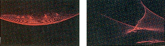 Soon the cusps of the hidden elliptic umbilic of the lead star began to appear. Two of them curved upward like the horns of a bull; the lowest one grew downward. By then the fold had became outwardly convex. Within minutes the emerging elliptic umbilic reorganized to become the internal structure of an unfolded hyperbolic umbilic-it consisted of a downward-pointing corner formed by two straightening folds. The structure marched downward while the fold at the bottom of the pattern advanced upward. When they met, they coincided neatly to form a single corner with straight sides at roughly 60 degrees: the singularity of a hyperbolic umbilic. Then the pattern split, one part becoming an outwardly convex fold and the other becoming an interior corner with curved sides. I had seen the complete unfolding of the hyperbolic umbilic from end to end and also its transformation from an unfolded elliptic umbilic! I moved the slide and its mount to a window, refilled the aperture and then sighted through the drop at a distant streetlamp in the otherwise dark outdoors. This time the performance was tiny, inverted from what had been on the wall and in white light instead of the laser's red light, but it was no less intriguing. Other small circles cut from the original template worked just as well. When Lock and I watched a similar performance later, we found I had seen only the first act of the play. The theatrical transformations of the act were dominated by inflection lines at the top of the drop. (When a card in the laser beam shadowed the top of the drop, the bottom of the wall display vanished.) The second act was a reversal of the first act, and its theatrics were dominated by inflection lines at the bottom of the drop. In the first act the wall pattern had been inverted from the drop, but in the second act evaporation had allowed the water surface to sink into the aperture, and the new curvature righted the pattern.