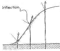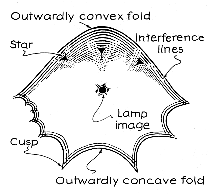 previous examples I argued that the pattern is inverted with respect to the drop. When you look at a distant lamp through a drop just in front of your eye, you do not see an inversion. For example, the bottom of the pattern comes from the bottom of the drop. The lack of inversion is an illusion. The pattern produced on the retina is actually inverted, as it is on a card, but the brain introduces a second inversion so that the world, including the drop and its pattern, appears right-side up. When the drop is on a vertical surface, the three-dimensional catastrophes unfold perceptibly because of the slump of the drop and the resulting sharper curvatures on the water surface brought about by surface tension. Recall what is seen through a drop on a spectacle lens. When the drop is small, cusps and outwardly concave folds appear. If the drop is distorted appreciably, they may overlap to yield an unfolded swallowtail When the drop is pendulous, the cusps and outwardly concave folds are restricted to the bottom of the pattern. They result from irregularities along the lower part of the drop's base. The top of the pattern, coming from the top of the drop, is an outwardly convex fold with internal stars.