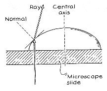 equal height. Place a drop on the slide and position a mirror below it to reflect the laser beam up through the drop. To reveal the refracted light, hold a white card horizontally somewhere above the drop. If the base of the drop is perfectly circular, the rays all go through a "central axis" running vertically through the center of the drop; on the card you are likely to see only a bright point where some of the rays happen to focus. If the slide is soiled or has tiny scratches, minute irregularities break the circular base of the drop-a dust mote might pull out a "finger" of water or indent a "cove" along the perimeter. Either irregularity imposes ridges and gullies along the side of the drop that alter the refraction of light. If there are only one or two irregularities, though, the surface of the drop in any vertical section remains convex even at a ridge or gully, and the light still yields little of interest on the card.