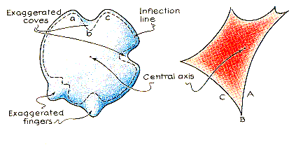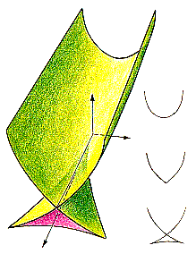 The distance, horizontally, between a segment of the fold and the axis depends on the tilt of the normals in the part of the inflection line that produces the segment. If the normals are barely tilted, so are the rays, and the fold segment is near the axis. When the normals are tilted somewhat more, the fold segment is more distant. The shape of the fold, then, depends on how the tilt of the normals varies along the inflection line encircling the drop. An overhead view of a drop (with its irregularities greatly exaggerated and with the inflection line indicated) is shown at the left in Figure 6. As the inflection line passes through a and approaches the cove from the left, surface tension forces it to climb up the drop to avoid passing through a short gully at the back of the cove. Along the way the normals in the inflection line become more tilted. The resulting fold is labeled A in the drawing at the right in the illustration, which shows what you would see if you looked down through a translucent card held over the drop. Another segment of the inflection line passes through c and approaches the cove from the right. It too climbs up the drop, producing the fold labeled c The two inflection lines meet at b, and their folds converge at a cusp (B)-another elementary catastrophe. A finger irregularity has similar effects, because there is a gully on each side of it where the base perimeter becomes concave as it begins to curve outward. A finger may create two cusps that overlap or, if it is wide, two distinguishable cusps. Folds and cusps are actually sections of three-dimensional catastrophes. Two such structures are the "swallowtail" (part of it resembles the tail of a swallow) and the "elliptic umbilic," which are illustrated in Figures 8 and 9. Each is shown in perspective with its long axis extending away from you, but when the illustration applies to a waterdrop on a horizontal surface, the long axis is vertical. A horizontal card held over the drop takes a cross-sectional slice through the structure, a slice perpendicular to the long axis. What you see on the card is the part of the structure h that is intercepted by the card.