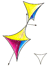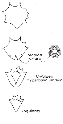 Here is a run-through of the entire play. The action starts when the bottom cusps retreat through the bottom fold and become stars. Recall that a star masks a triangular arrangement of folds and cusps, with one cusp pointing downward. When the first star begins to transform into a corner, the folds on the left and right sides of the triangle emerge from hiding and begin to straighten to form the corner. Meanwhile, the top fold of the triangle moves upward on the wall, comes out of hiding and sprouts an upward cusp. The cusp is a clone of the one that created the star but is inverted in orientation. For example, if the original downward cusp was on the left side of the wall pattern, its upward clone is on the right side. As another star undergoes the transformation, its corner aligns with the first corner and another cloned cusp sprouts. As more stars are transformed, the corner pattern on the wall brightens and the region of sprouted cusps becomes crowded. The internal structure of the wall pattern comes to resemble an ice-cream cone with spikes sticking out of the top. In the meantime, the external structure of the pattern on the wall shrinks and takes on the same cone shape. The singularity of the hyperbolic umbilic is reached when the bottom parts of the cones are completely straight and overlapping. The roles of the two structures are then reversed: what had been the external structure continues to shrink while what had been the internal structure continues to expand. The new internal structure begins to release a flock of new stars, each of which migrates downward on the wall, passes through the bottom fold of the new external structure and becomes a cusp. The final pattern on the wall is largely an inversion of the h initial one.