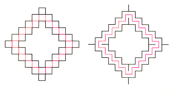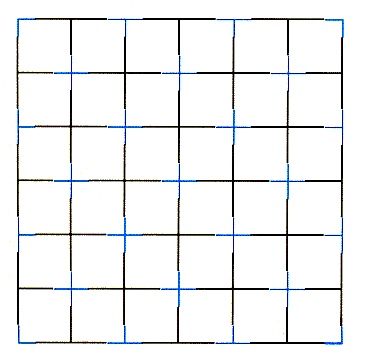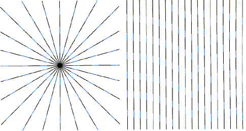 With the results from these and other experiments, Redies and Spillmann conjectured that neon spreading is a result of the activity of visual cells that detect the presence and orientation of lines and that are sensitive to line lengths corresponding to the angular ranges given above. Apparently the neon spreading takes place only if the line segment has straight continuations at each end and if the continuations differ from the segment in brightness or color. If the continuations are misaligned, the averaging and spreading disappear; they also disappear if there is only one continuation. When a colored cross replaces an intersection in a black grid, the color spreads from both lines of the cross, but the spreading is more extensive than just the sum of the neon flanks along the lines. This result suggests that the visual cells detecting each arm of the cross may interact. In 1984 Redies, Spillmann and their associate Kristian Kunz continued the study of neon flanks. Two of their figures appear in Figure 7. In the one at the left, notice that near the center of the star the blue lines are close enough for the color to spread between them, making a blue ring; farther out the blue lines provide only neon flanks. Neon spreading can also be seen in the figure at the right wherever the blue segments either are lined up or are shifted from one another in an orderly way. Where the positions of the segments are scrambled, you see only neon flanks.