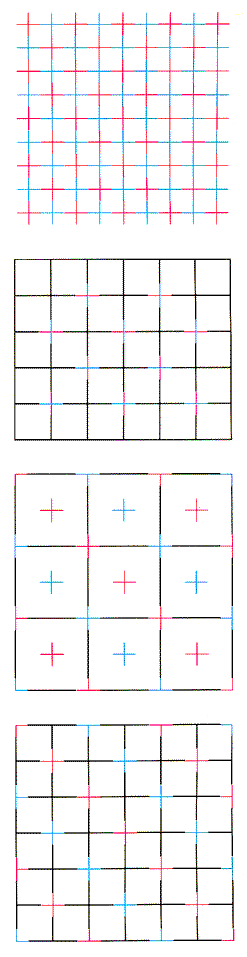 When red or blue crosses are isolated from the grid lines, as in the second figure from the top, they fail to pr duce neon spreading at any angle orientation; the juxtaposition of the grid's black lines with a cross must then, be vital to the illusory spread of color. Notice also that an isolate cross is more sharply defined and contrasts more with the background that does one enmeshed in the grid: in previous examples, neon spreading makes the cross look dull and murky. Two more variations are seen at the right. In the third figure from the top each cross is made up of one red line and one blue line. Colors spread from both colored lines but not as much as in the previous examples. In the bottom figure the black lines are eliminated, so that the grid consists solely of red or blue crosses. Yet the neon spreading of each color is robust and even yields slanted colored lanes. The result adds a new rule about brightness. In this case either the red or the blue crosses can be considered the "grid," and the crosses of the other color are taken to be the "crosses." Neon spreading can apparently appear when both elements are about equal in brightness but are darker than the background.