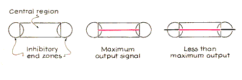 Following clues from other studies of vision, Redies, Spillmann and Kunz proposed that the "end-stopped" cells in the visual cortex are responsible for the dulling of a colored line when neon spreading or neon flanks appear, and that they may figure in the entire illusion. Most cells in the visual cortex have the assignment of detecting lines, but the end-stopped cells have the particular assignment of detecting short lines. The visual field of an end-stopped cell has an elongated central region with inhibitory zones at each end [see Figure 6]. If both end zones are activated, they inhibit the activity of the central region. The design renders the cells sensitive to short lines, making them promising candidates in explanations of neon spreading. When a line excites a cell, the line is said to have been "projected" onto it. (To be sure, the only true optical image lies on the retina only electrical signals reach the brain. But the idea of projection simplifies the description of how a cell works.) Suppose that a short red line on a white background lies on your direct line of sight and that its projection is on one of the end-stopped cells that monitor foveal viewing. If the projection is skewed with respect to the long axis of the cell, the cell ignores it, but if the projection is aligned with the axis, the cell sends a signal deeper into the visual system. When the projection occupies only the central region of the cell, the signal is maximum, conveying the information that a dark line lies on a brighter background. What you then perceive is a short red line that contrasts well with the background. Now suppose that the red line has black continuations at each end and that the continuations pass through the end zones of the cell. The end zones inhibit the discharge triggered by activation of the central region, and so the output signal is less than maximum, which indicates that the line is not as dark as it was when it stood alone. What you now perceive is a red line that has less contrast with the background: it is dulled, as is the case when either neon spreading or neon flanks appear in the illusory illustrations. An end-stopped cell may dull a line, but can it also spread the color perpendicularly to the line? No one knows yet, but a few months ago Redies wondered whether an end-stopped cell might interact with other, adjacent cells to spread the color of the line onto the adjacent background. One check will be to determine how large an angle a line can occupy before its projection exceeds the central region of an end-stopped cell. Does the angle match the upper limit of about 35 minutes that Redies and Spillmann reported for neon spreading in foveal viewing? Other questions also remain. When a black grid with colored crosses is tilted, why does neon spreading weaken? Does the result reveal that end-stopped cells respond primarily to horizontal and vertical lines? Why does the spreading also disappear if a cross is encircled with a black line? And what visual cells are responsible for subjective contours? It seems to me that the brightness rules for neon spreading can be explained by the end-stopped-cell model, if one assumes that the extent of the spreading is related to the amount of inhibition by the end zones. For example, recall that for the illusion to appear on a bright background, the colored lines must not be as dark as the black lines. To see why, again consider a short red line with black continuations. The fact that the continuations are quite dark means that the end zones diminish the output from the cell to a great extent, which may mean that the neon spreading and the dulling of the red line are enough to be perceptible. Now consider how a short black line with red continuations affects a cell. The central line, being quite dark, tends to make the cell fire strongly, and the continuations, being lighter than the central line, produce only a small inhibition- and so also less neon spreading and less dulling of the central line. Although this line of reasoning is interesting, it has not yet been experimentally tested by neurophysiologists.