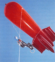 For your first flight, gather all the required equipment in a suitable spot. Load the camera with film and test the radio-control system. Then launch a small helium balloon tied to a 10-meter tether. If the balloon is blown to the ground, it is too windy to fly the camera platform. Before you inflate a trash bag with helium, squeeze all the air out. Next gather the bag's open end over the helium-tank nozzle and hold it in place while the gas flows inside. When the bag is full, twist the gathered opening,. bend it over against itself and secure it in place with tape. Tie a two-meter length of nylon tether above the taped region. Make a loop out of the other end and temporarily connect the loop to a snap swivel, such as those used in fishing tackle [see illustration at left]. The snap swivel should be attached to a block of wood, which you can later use as a ground anchor. When all the BPTBS are inflated, attach the loops at the ends of their lines to another snap swivel tied to the camera platform. Be certain that the tether attached to the camera platform is temporarily but securely anchored to the ground. Trash bags and spherical balloons have the aerodynamic properties of tumbleweeds. Even a light breeze will blow down a tethered balloon if its lifting power is only slightly greater than its payload. You can compensate for this imbalance by launching upwind from the point you wish to photograph. Attach the tether reel to a ground anchor downwind from the target. Hold on to the balloon and walk upwind, unwinding the tether as you go. Then release the balloon and race back to the tether reel. (Please watch the ground during this phase of flight.) Watch the camera carefully as it approaches the target. When it is reasonably still, press the transmitter fire button. If the camera is swinging, press the button when the camera is at the apex of each swing.