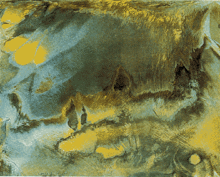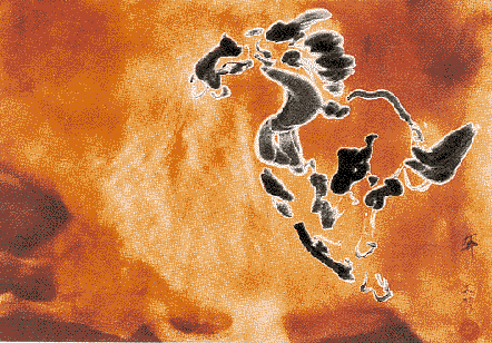 I used only the most basic chromoskedasic methods to create Among the Coral Reefs, the abstract painting at the right. I removed a piece of Kodak Polycontrast 3RCF black-and-white photographic paper (60 by 40 centimeters) from its protective covering. After exposing the paper to dim red light for five minutes, I poured about half a cup of a 10 percent solution of Kodak Ektamatic S30 Stabilizer onto the paper. I swirled the stabilizer on the paper in an attractive pattern. The regions exposed to the stabilizer would eventually emerge as light yellow. On other areas of the paper, I immediately poured a small amount of 10 percent solution of Kodak S2 Activator, followed by a 50 percent solution 5 of Dektol. These chemicals produced reds, oranges, yellows, greens, blues and grays. I exposed the paper to light from a fluorescent lamp for five minutes. Finally, I bathed the paper in a 50 percent solution of Kodak Rapid Fixer, then rinsed the paper with water and allowed it to dry. With a little more effort, readers should be able to create images like To Run, shown at the right below. Using an artist's brush and black ink, I painted a running horse on rice paper. I then took a photograph of the horse using Kodak black-and-white film and developed the negative. I used a photograph enlarger to transfer the negative image onto a piece of Kodachrome paper (20 by 25 centimeters).