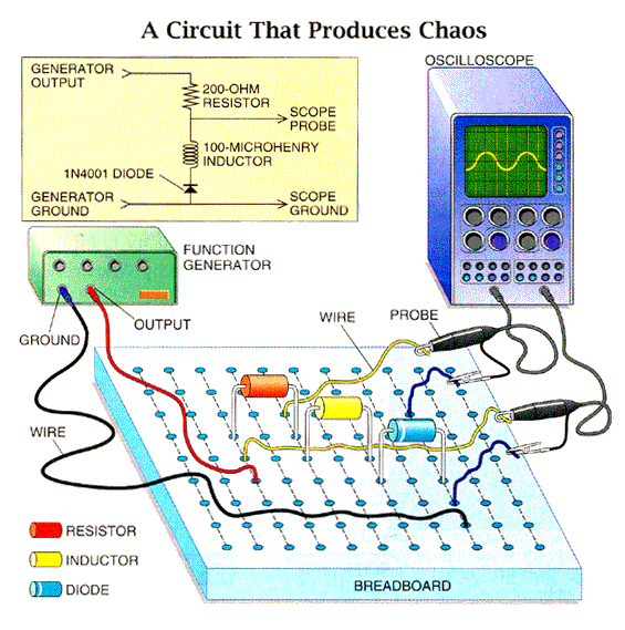 One of the best ways to experiment with chaos is to build an electronic circuit such as the one depicted in the diagram below. The circuit serves as a paradigm for chaotic systems. When the circuit is subjected to certain voltages, it produces a signal that is chaotic. In 1981 Paul S. Linsay of the Massachusetts Institute of Technology was the first to study rigorously the circuit's behavior. Since then, many physicists have attempted to explain how the circuit generates chaos. When I learned about Linsay's experiments, I was struck by the fact that a simple circuit could produce such complicated and interesting behavior. I had seen computer simulations of chaotic systems, but here was a chance to study the chaotic dynamics of nature firsthand. As an amateur scientist, I decided I wanted to see chaos for myself. And with a little bit of effort, I even found a way to listen to it. To construct the circuit, all you need is some basic electronic components: a resistor, an inductor and a diode. I recommend that you start with a resistor of 200 ohms and an inductor of 100 millionths of a henry, the unit of inductance. I have found that many different diodes will work, including lN4001,lN4004,lN4005 and lN4007. You can buy a handful of resistors, inductors and diodes for less than $20. I purchased the components from a mail-order company. You can also try a hobby store that carries electronics. The circuit can be assembled on a breadboard, which is a plastic block with rows of holes to accommodate components. The board costs about $10. To supply the input signal, you will need a function generator, which can be bought for around $200. To measure and view the output of the circuit, you are best off using an oscilloscope. If you do not own an oscilloscope and a function generator, you can probably arrange to use them at a department of physics or engineering at a local college. I wanted to have a scope of my own so that I could perform experiments at home, but I could not afford to pay the $1,000 for a new one. Hoping to buy a used scope, I posted a notice on a bulletin board at Argonne National Laboratory. A week later I was contacted by someone who repairs fire alarms and happened to have an oscilloscope for sale. He invited me to his workshop to take a look. The room was filled with electronic parts: dismantled computers, old antennas, disassembled radios, stacks of power supplies. I knew I was in the right place. He sold me a 15 year-old oscilloscope for $100. Once you have obtained all the equipment, it will not take long to assemble the circuit. The components are connected in series: first the function generator, then the resistor, then the inductor and finally the diode. You might be aware that the orientation of a diode is an important consideration when building a circuit. A diode has two terminals, known as the cathode and the anode. The cathode terminal is almost always marked by a band on the diode. Ideally, a diode allows current to flow only from cathode to the anode and not the other way. When you build the chaos circuit for the first time, I recommend that you connect the cathode terminal to the inductor and the anode to ground. But if you do insert the diode the other way, you will find that it makes very little difference. To monitor the output of the circuit, clip an oscilloscope probe between the resistor and the inductor. If your scope has a second probe, use it to measure the input. Check all connections and make sure that all components are firmly seated in the breadboard.