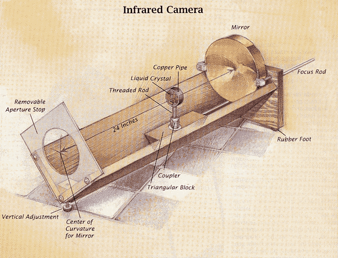 To test the design of my camera, I started with a heat lamp, a shaving mirror and a liquid crystal from a "mood sensor." I used the mirror to focus the radiation from the lamp onto the liquid crystal. Within a second or so, an image appeared on the liquid crystal. It bloomed rapidly into a large circle. Unfortunately, I could not tell whether the liquid crystal was responding to infrared radiation or to the heat generated when the crystal absorbed the visible light from the lamp.