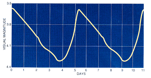 Getting accurate distance figures is usually not straightforward. Because of the range of magnitudes in the period-luminosity relation, distance calculations can be off by a factor of two or three. To correct for this uncertainty, astronomers generally rely on observations of several Cepheids in proximity. For example, I discovered 29 Cepheids in the galaxy NGC 3109. I fit their apparent magnitudes at maximum light into the graph of the period-luminosity relation [see Figure 3]. The fit yielded a distance of 1.9 megaparsecs. Even this figure is only approximate, since it is not corrected for absorption by the intervening interstellar matter. Accurate distance measurements usually demand large telescopes, filters and complicated techniques to extrapolate measurements from one celestial body to another. As such, determining distances is a task best left to the professional. Yet the amateur is not left completely out in the cold. You can readily determine a Cepheid's brightness over time and display the information as a light curve. One of the most useful resources in making observations of variable stars is the Astronomical Almanac. This reference (available from the Superintendent of Documents, U.S. Government Printing Office, Washington, D.C., 20402) lists the variable stars visible to the naked eye. The information includes the names of the stars, their type and . location and their period of variability. The almanac also lists a recent time of maximum light, which can be used to predict future maximum brightness. Stellar brightness is expressed in terms of the magnitude scale. Each unit on the scale corresponds to a luminosity difference of 2.5 times. Fainter stars have larger magnitude numbers; the brightest objects in the sky have negative numbers. For instance, the sun shines at magnitude -26. The unaided eye can detect objects up to a magnitude of about six. The times given in the almanac are in Julian days, which is a running decimal number related to the dates and times of events. Julian dates are much more convenient than ordinary calendar dates. To obtain the interval between events, you simply subtract the dates. Section B of the almanac lists the equivalent calendar dates. The general strategy for observing Cepheid variables is to measure the brightness of a Cepheid at many times over many cycles. There are two ways to collect the data on light variation. The first is simply to use the unaided eye and make informed estimates. The second is to photograph the star and determine the brightness by measuring the size of the image. In either case, begin by making the first set of measurements close together over one or two cycles, so you can get a rough idea of the period. Then wait for a few cycles and take a second set of measurements. But do not wait too long: when the number of cycles multiplied by the uncertainty in the period equals one period, you would be off in the cycle count by one. Pause for several more cycles before taking a third set of observations. You can repeat this process indefinitely. Knowing the number of cycles between the observations, you can "phase" together your observations to produce an accurate value for the period. I use a computer program to perform the task; the section "Finding the Period" below describes the algorithm.