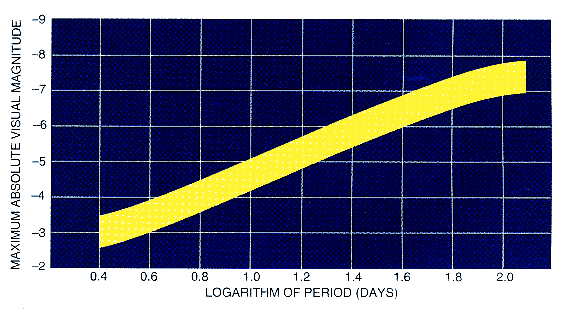 The procedure to observe Cepheids with the naked eye is simple in principle and is attributed to the German astronomer Friedrich W. A. Argelander You select ordinary (nonvariable) stars to compare with the Cepheids. The apparent magnitudes of the comparison stars should cover the full range of the variable's brightness. The comparison stars should be located in the sky as closely as possible to the variable, so that each comparison star and the variable are in the same field of view. Ideally, the comparison stars should differ in steps of 0.3 to 0.5 in magnitude. I label each comparison star in an alphabetical order based on brightness, with "a" being the brightest. At the time of observation, decide which two comparison stars have magnitudes that bracket those of the variable. Then try to estimate to the nearest tenth the relative brightness of the Cepheid in the bracketed interval. Thus, if you estimate that the magnitude of a variable is 0.4 between those of comparison stars b and c, write b4c as the magnitude (the Cepheid observer's shorthand). You can convert to the actual value by interpolating between the known magnitudes of b and c. Of course, suitable comparison stars may not lie close enough to the variable. In that case, you would need to shift your line of sight back and forth between the stars to estimate relative brightness. Visual memory is very short; when you concentrate on the seconcl star, your eye has "forgotten" how bright the first one looked. In addition the twinkling of stars makes it more difficult to judge their brightness. Even so, with practice, your ability to estimate brightness can improve. In fact, with only three levels of brightness, the period of a variable can be found with reasonable accuracy. Try the technique on Delta Cephei, which has an apparent visual magnitude of 3.48 at maximum and 4.37 at minimum. Locate Beta Cephei (magnitude 3.23) from a star chart and use it as comparison star a. Use Epsilon Cephei, at a magnitude of 4.19, as comparison star b. Observe Delta Cephei once a night for a week or two, and write down its time and brightness as compared with a and b. If the brightness of Delta Cephei is in between those of a and b, simply write a5b. These three values can provide a crude estimate of the period. With a little practice and some luck with the weather, you should be able to refine your estimates. The almanac lists other Cepheids and suitable comparison stars if Delta Cephei is not easily seen from your location. A more accurate means to record Cepheid variability is through photography. Because film can detect objects K' too faint for the naked eye, you can conduct a photographic study of Cepheids not even listed in the almanac. You will need a camera mounted to your telescope and a clock-drive unit (a tracking mechanism that follows the apparent motion of a celestial body). For a variable such as Delta Cephei, a typical exposure through a small telescope would be about 10 seconds. You should, however, take several photographs with different exposure times and select the best time. I recommend doing your own developing so that you can keep the processing consistent from one roll of film to the next. Film records the light intensity of stars as size: the brighter the star, the larger the image. Thus, you will need to correlate the diameter of a stellar image with a star whose magnitude is known (magnitudes are printed in the almanac and other handbooks). In my astronomy course, I use the open cluster NGC 6940 to teach my students how to perform the task. I use a 12-power comparator (essentially a loupe) to measure the images of the 15 stars in the cluster on an enlarged print. The comparator contains a reticle that has a linear scale with 0.1-millimeter divisions (available from scientific-equipment supply companies). You should be able to estimate sizes to within a few hundredths of a millimeter. A plot of the magnitudes of these stars against the logarithm of the square of the diameters yields a straight line [see illustration below right]. Once calibrated, you can find the magnitude of any star (including possible Cepheids) in the field of view. Just measure the star's diameter and use the calibration line to convert. Each photograph will have to be calibrated in this way.