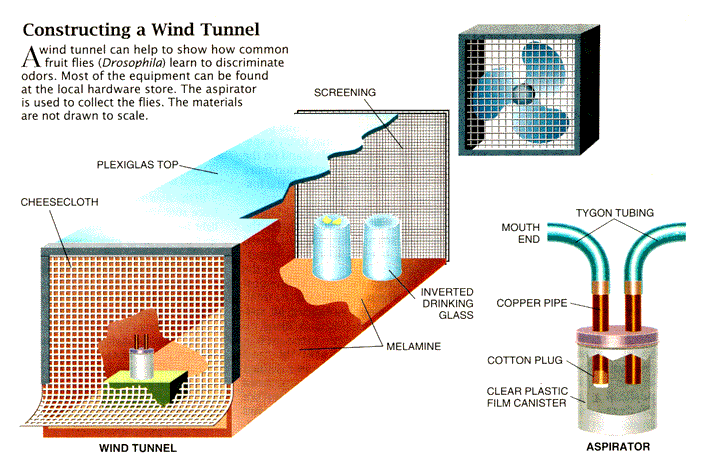 You can see how insects can be taught to respond to an odor by raising some fruit flies on various food sources and testing them in a wind tunnel. The tunnel isolates the insects in a given area and provides the odor plume that the flies will use to locate food. The setup described here is similar to those used by researchers to investigate associative learning in wasps. Most of the material can be purchased at a hardware store. Rearing the insects is the easiest part Of these experiments. Anyone who has purchased fruit and let it sit on the kitchen counter has essentially "raised" the common fruit fly (Drosophila). To establish a number of Drosophila colonies, place a piece of fruit in the bottom of a clear jar. I used peeled bananas, but peaches, apples or oranges would also be good choices (use only one type of fruit). The jar should not be too small; otherwise you may end up with Drosophila that have developed poorly and cannot fly well. Place the jar outside and watch the fruit for visiting adult insects. Many different insect species will come to the fruit, but they will not affect the project. If you have the patience, you can catch sight of the female Drosophila as she lays her eggs on the fruit. After two to three days, bring the jar inside. Place a double layer of cheesecloth over the jar opening and secure it with a rubber band. To keep the atmosphere inside the jar moist, it may be necessary to put a wet paper towel over the cheesecloth. Never leave standing water in the jar. Depending on the room temperature, the eggs will hatch in about 21 hours. The larvae will not be visible for at least three to four days. On about the fifth day, they will crawl out of the fruit and up the walls of the jar. There they will pupate. The adults will emerge in about five days and will mate and lay their eggs in the fruit. In the experiments, I achieved the best results if the adult flies were at least four to five days old. You will need to construct an aspirator to suck the insects out of the jar, because Drosophila are too small and fragile simply to pick up. To build the aspirator, you will need two copper pipes, about 1.5 inches long and about one-quarter inch in diameter, and 30 to 40 inches of flexible, plastic tubing, such as Tygon tubing. The pipes should plug tightly into the tubing; you may have to spend a few minutes at the hardware store mixing and matching. You will also need a clear plastic 3 5-millimeterfilm canister or something similar. Puncture two holes in the lid of the canister and insert a copper pipe through each hole. Stuff some cotton in one of the pipes; do not pack it in tightly. Cut the Tygon tubing in half and attach one onto each piece of copper pipe. Snap the cover back on the canister. To check for leaks, place the tube connected to the cotton-plugged pipe in your mouth and hold your finger over the end of the other piece of tubing. You should be able to feel a vacuum when you suck. If you do not, there must be a leak. Make sure that the cap is on tight and that no air is getting in around the copper-tubing connections. Leaks can be plugged with modeling clay. Now you can use the aspirator to collect the fruit flies. Insert the tube without the cotton plug into the fruit fly jar and suck on the other tube. The flies will end up in the film canister. The cotton plug will keep the flies from going up the tube into your mouth. There is no harm, however, in swallowing them. Most of us have eaten a bug or two before anyway. If your aspirator does not work properly, check to see if the cotton is packed too snugly or if there are leaks. You may need to reduce the length of the tubing or to adjust the diameter. Sucking harder is not likely to be the answer. To test the flies, I constructed a wind tunnel 49 inches long, 24 inches high and 30 inches wide. These dimensions were chosen because I used a pre-cut material called Melamine. It is a kind of veneered particleboard often used in shelving. Melamine comes in white, which makes the insects more visible. Its smooth, polished surface also minimizes wind turbulence. Secure three pieces of Melamine to form the sides and bottom. Two one-inch by two-inch pieces of wood were used for the support across the ends. I purchased a piece of Plexiglas of approximately the same dimensions for the top of the wind tunnel. At one end I pulled two layers of outdoor screening tightly across the frame to straighten the wind path and reduce its speed. At the other end I secured cheesecloth, leaving the bottom free so that I could easily reach into the tunnel to add the insects. (Make sure the cheesecloth is long enough to tuck under the bottom.) A large standard box fan created the wind. I suggest setting it on its lowest speed and positioning it approximately four feet from the screened end. There should be just a slight breeze inside the tunnel. Remember, you are flying fruit flies, not jumbo jets. For accurate results, an even and bright luminescence over the entire length of the tunnel is necessary. One long fluorescent light strip or two rather large and bright floor lamps placed on opposite sides and on opposite ends of the tunnel will do. Background odors may also present complications. I noticed that if I tried to fly the insects after cooking an odorous dinner, the flies did not seem to be as efficient at finding the fruit odors as they did when I went out to eat. Either they did not like my cooking or they were distracted by the extraneous odors. (I hope it was the latter.) The fruit needs to be sitting on some kind of platform about 10 inches above the tunnel floor and about three to six inches from the screen. I found that inverted narrow drinking glasses worked nicely. Place two of them in the tunnel, each about two inches from the sides. To see if your wind tunnel is working properly, you will need to "test fly" a few of your insects. After capturing the flies in the film canister, give them a few minutes to settle down. De