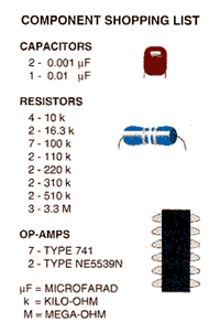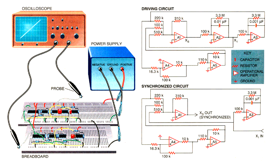 Louis M. Pecora of the U.S. Naval Research Laboratory first came up with the idea of synchronized chaotic systems. He and one of us (Carroll) used a computer simulation to show that such a phenomenon can exist. The next step was to demonstrate the idea using physical systems-specifically, electrical circuits, which are accessible and inexpensive. The first circuit that Carroll built to display synchronized chaos was based on a design devised by Robert Newcomb of the University of Maryland. Although the circuits described here are simplified versions of Newcomb's, experience with circuit assembly might be helpful. A good introduction to chaos in electrical circuits, using only a diode, an inductor and a resistor, appeared in this column last year [see "How to Generate Chaos at Home," conducted by Douglas Smith; SCIENTIFIC AMERICAN, January 1992]. Basically, the setup will consist of two circuits: a driving circuit and a synchronized circuit [see illustration below]. The two are identical except for an important component missing in the synchronized circuit. The two circuits are connected at a single point. The chaotic output of the synchronized circuit will match that generated by the driving circuit if both circuits are correctly built. Before buying the electronics parts and constructing the two circuits, make sure you have an oscilloscope, breadboards and a power supply that can deliver 12 to 15 volts of direct current. (Breadboards are thin sheets of plastic that have holes to accommodate electronic components; purchase ones that will hold the positive, negative and ground terminals from the power supply.) The power supply and breadboards are cheap and easy to come by. Oscilloscopes, unfortunately, are expensive; they start at about $500. You can sometimes buy a cheap, used oscilloscope at a "hamfest"-a flea market for ham radio enthusiasts. If you do not wish to purchase an oscilloscope, you might be able to get access to one at a local college laboratory. The device should provide two channels and be able to plot the input to the channels against each other. For the circuits themselves, you will need various resistors, capacitors and integrated chips called operational amplifiers (op-amps). A list of such items and the minimum quantity you need appears below. We recommend buying more than the minimum, because it is easy to make connection errors that can burn out the components, especially the op-amps. Because the two circuits must be as similar as possible, it is essential to use resistors and capacitors that have high tolerances. Look for resistors rated to be accurate within 1 percent and capacitors made from polypropylene, which do not leak much current. All but two of the op-amps are generic type 741. The exceptions, labeled "A4" on the schematic [see right illustration in Figure 1], are so-called high-frequency uncompensated op-amps. The particular ones used here were type NE5539N. These two are the most critical components of the circuits, as they are ultimately responsible for keeping the circuits synchronized. The components we used were purchased from Digi-Key Corporation in Thief River Falls, Minn. The total price was less than $30. When ordering, remember to ask for the pin diagrams for the op-amps, which contain several connections that all look alike. The specification sheet describes the configuration of the pins so that you will know which ones to use. To decrease the possibility of wiring error, it is best to lay out the circuits according to the schematics before connecting them. Start with the op-amps, using one breadboard for each circuit Observe that the synchronizing circuit is identical to the driving circuit, minus an op-amp and its ancillary components. The next step is to make the power connections (be sure the power supply is unplugged before beginning). Only the op-amps draw current. Attach wires from the positive, negative and ground terminals to separate rows that run along the top and bottom of the breadboard. These rows are dedicated solely to providing voltage to the electronic components. Use the op-amp spec sheet to determine the appropriate connections from the pins to the rows. The ground wires should be as short as possible because long ground connections can pick up noise, which would keep the circuits from synchronizing. After hooking up the power supply, begin connecting the components systematically. Although the schematics are simple, it is easy to create a mess. Short, color-coded wires make the circuit convenient to read and check over. Take several different visual walks through the circuits to verify that all of the connections are correct. Writing down the color codes of the resistors next to their values on the schematic may speed up this process. Once you are satisfied that your circuits are correct, connect the synchronizing circuit to the driving circuit at the points marked "Xl" on the schematic. Notice that as a result of the connection, the two circuits have the same nonlinear driving component (the subsystem that uses the A2 op-amp). Connect each channel of the oscilloscope to the points marked "Xs" on the schematic. Each such point is located just after the A1 op-amp. Make sure that the circuits and the oscilloscope all have the same ground-that is, the grounding wire attached to the oscilloscope's probes should be hooked up to the same ground line as the circuit Check the circuits several times before plugging in the power. If you burn out one of the op-amps, you can plan to spend at least a few minutes trying to figure out which component is broken and replacing it.