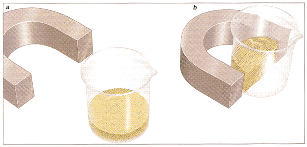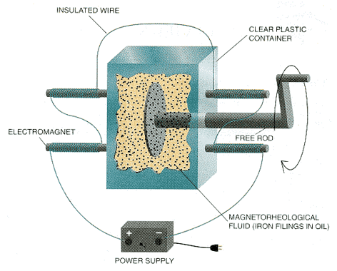 Such mixtures consist of particles suspended in a fluid. When the substance is exposed to a magnetic field, the particles align in such a way that the mixture becomes solid. When the field is removed, the particles return to their random state, and the substance liquefies. The degree of solidification depends on the inherent properties of the fluid and the strength of the applied magnetic field. Magnetorheological fluids are not as common as a similar class of materials that solidify in the presence of electric fields. These electrorheological fluids have been incorporated in prototype brake systems, clutches, shock absorbers, engine mounts, actuators, control valves and even artificial joints [see "Electrorheological Fluids," by Thomas C. Halsey and James E. Martin, page 58]. Yet amateur scientists would be wise to experiment with magnetorheological fluids before they attempt anything with the electrical counterparts. Most electrorheological fluids require high voltages. For example, several thousand volts would be needed to solidify a mixture of corn oil and cornstarch. (The actual amount of electric current that would flow through the liquid would be quite low, however.) Although present magnetorheological fluids are not as versatile as their electrical cousins, they do demonstrate the effect that so excites many researchers. The experiment described here can be performed on the kitchen table for less than $20. A simple magnetorheological fluid is made of iron filings and corn oil. You can find iron filings at a toy store, at your workbench or at a machine shop Specifically, you could empty the filings out of a toy magnetic sketch pad; you could scrape a piece of iron with a good metal file; or you could gather the iron filings produced by a metal lathe. The size of the filings will determine the magnitude of the magnetorheological effect observed. The filings should be large enough to identify single particles with a magnifying glass but preferably less than half a millimeter long. Filings that are too large can easily be ground to a smaller size with a spoon and a hard surface. Be aware that iron will scratch the surface. The type of oil needed to suspend the filings does not matter much. It just has to be more viscous than water, to slow down the rate at which the filings settle. I have used corn oil, linseed oil, silicone oil and motor oil. Corn oil is perhaps best: it is cheap and cleans up relatively easily with soap and water. The filings and oil should be mixed in a small, clear container, such as a clean aspirin bottle, a plastic cup or, as I used, a 100-milliliter beaker. Just make sure that you can see down into the bottle. The fluid should consist of approximately 25 parts by weight oil to 100 parts by weight iron filings. The exact proportions of the constituents, however, are not critical to observing some kind of magnetorheological effect. As for the magnetic field, almost any type of strong, permanent magnet will work: horseshoes, bars, even the ones from old loudspeakers. (Refrigerator magnets are typically far too weak.) Magnets are often rated by the number of pounds they can pull. You should buy the most powerful ones available. I purchased two "100 pound" bar magnets from a local hardware store for about $12 apiece. Electromagnets are also an option Such magnets are made by winding thin, insulated wire around a metal bar and connecting the ends of the wire to a battery. The magnetic field will be strongest near the ends of the coiled wire. It does not matter whether you wind the wire from one end to the other or back and forth several times. Just be sure that the wire is always wound in the same direction (that is, clockwise or counterclockwise) and that the winding is tight. Two layers of windings over a couple of inches of the core should suffice. To amplify the strength of the magnetic field, you can increase the power supplied to the electromagnet by connecting several batteries in series. Note, however, that the electromagnet draws a lot of current and will quickly drain the batteries. A power supply that can deliver several volts may be a better choice. Although it is quite fun trying to create a good electromagnet, it is hard to beat a permanent magnet in terms of both time and convenience if your goal is to play with a magnetorheological fluid. Once you have your fluid and magnet ready, you can observe magnetorheology. First, stir the fluid with a piece of wood or plastic (the filings will adhere to a magnetizable object), keeping the magnet at least six inches from the container. You should notice that the combination of filings and oil behaves as a fluid: it continues to fill the container and tends to form a smooth, flat surface after you stop stirring. It has the consistency of maple syrup. Bring the magnet near the container. If you are using a horseshoe-shaped magnet, put the container just inside the two legs. If you have two magnets, place the opposite poles on either side of the container, facing each other. The closer the poles are, the stronger the magnetic field in the fluid will be. If, you have just one magnet, place one of the poles directly on the side of the container. Stir the fluid again and notice how it begins to behave like wet sand. Distinct, stringy clumps should form at the bottom of the container. These clumps should retain their shape and remain suspended in the fluid after you remove the stirrer. The clumps appear stringy because the filings tend to attach end to end to one another, extending from the poles of the magnet. Now move the container away from the magnet. The filings-and-oil mixture will rapidly change back into a fluid: the clumps fall apart, and the surface becomes fairly smooth and horizontal. If you do not observe the effects, you probably either need to get a stronger magnet or need to change the consistency of the fluid. As a variation, repeat this experiment with different proportions of the filings and oil. Th