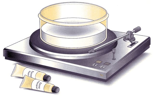 A simpler variation of this procedure, which can be done at home, is to use a liquid that hardens, so that the parabolic surface is preserved after the spinning has ceased. Epoxy fits the bill. Consisting of a mixture of a resin and a hardener, epoxy slowly cures to a solid with little change in shape. The resulting mirror cannot compete against aluminized glass mirrors for image quality; it is perhaps best suited as a collector of light at the infrared and microwave end of the spectrum. We have relied on this method to produce an inexpensive mirror the size of a satellite dish to be used for observations of the cosmic microwave background radiation. A turntable from a stereo system is the ideal device on which to spin the liquid. Be sure to remove the phonograph cartridge. The record player does not have to be of the highest quality- we have found that minor variations in turntable speed do not seriously affect the mirror. Those who have switched to compact discs should be able to find a secondhand turntable without too much trouble or expense. The container to hold the spinning epoxy can be anything, even a common dinner plate, but we like to use food storage containers made of polyethylene or polypropylene. Such plastic containers are practical because the epoxy does not stick to the surface very well. The spun mirror pops out easily after the epoxy has cured. The container must have enough depth so the liquid does not spill over the sides during rotation. It can be any diameter so long as it can spin freely on the turntable. Be aware, however, that a majority of turntables operate only when the tonearm is cued over the edge of the platter. To provide clearance for the tonearm, you may need to choose a container that has a diameter slightly less than that of the platter. The best epoxy is one that has the lowest viscosity and longest setting time. (Viscosity is the thickness or runniness of a liquid.) The epoxy should flow at least as well as warm maple syrup. The epoxies we tried were type CRS-107 from Custom Resin Systems in Carver, Mass., and Stycast 1266 clear epoxy from Emerson & Cuming in Canton, Mass. These two varieties are by no means the best or only choices. The number of epoxies available is truly astounding, so check the local hardware store or look under "epoxy" or "resins" in the yellow pages for a suitable one. You will probably need no more than about 0.1 liter (several fluid ounces) for each mirror. As for setting time, we recommend choosing epoxies that have a one- or two-day cure period if you plan to spin mirrors larger than about 30 centimeters in diameter. Smaller mirrors should be made from epoxies that cure in no less than four to six hours. Do not use the quick-drying, "five-minute" epoxy. Epoxy usually comes in two separate containers: one for the resin and the other for the hardener. They must be thoroughly mixed so that the resulting liquid is uniform. Follow the package instructions to determine the right proportions. Epoxy is generally safe to use, but some caution should be exercised. The chemicals involved are rather nasty; gloves and good ventilation are required. Also, you may feel some warmth coming from the epoxy because the chemicals give off heat as they cure. If you intend to spin several mirrors and want to prepare large amounts, mix the epoxy in batches of no more than a liter at a time and keep the batches separate. It is possible that larger batches could smoke or even catch fire. (The fast-drying epoxies are the most susceptible types, one of the reasons to avoid them.) To determine exactly how much epoxy to use, spin some water in the container first. Pour in just enough so that it wets the container but does not spill out during rotation. Make sure the container is centered on the platter. If necessary, adjust the tilt of the turntable so that the water spreads uniformly across the surface. Measure the amount of water used and mix that much epoxy. Be sure to dry the inside of the container completely before pouring in the epoxy, because moisture prevents many epoxies from curing properly. The turntable must spin until the epoxy has cured. It is important to use a "windscreen," that is, a plastic wrap over the spinning liquid. The breeze generated by the rotation can cause ripples to form on the surface. If you do find defects in the dried epoxy, just repeat the procedure with another coat. In fact, we have found that two thin coats produce a smoother surface than does one thick coat of the same volume The cured epoxy has the stiffness of a hard piece of plastic, like an acrylic The focal length will be proportional to the square of the rotation period. A turntable speed of 45 revolutions per minute (rpm) will yield a focal length of about 22.1 centimeters. A speed of 33 rpm gives 41.1 centimeters. A heavy container may make the turntable speed somewhat inconsistent and affect the focal length. The surface can be made reflective through chemical silvering, a technique popularized by amateur telescope makers. You can ship your cured epoxy to a silver-plating company. The prices such shops charge vary greatly, ranging from a few dollars to about $70 per square foot. Alternatively, you can do it your self. Peacock Laboratories in Philadelphia offers the chemicals and detailed instructions, although the kits may be more appropriate to group projects. Each kit sells for just under $300 and provides enough material to coat 300 to 500 square feet of mirror. Like epoxy, these chemicals are somewhat noxious, so gloves and good ventilation are again recommended. The single most important requirement in obtaining a good silvering is a clean surface. Follow the cleaning instructions given in the kit; you will need distilled and demineralized water for the final rinse.
