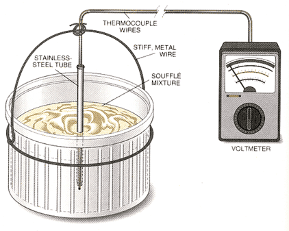 Gently fold the cheese mixture into the egg foam. Then ladle the mixture into the five soufflé dishes so that it comes about two thirds of the way up the sides. The experiment on each soufflé consists of measuring its internal temperature during the cooking, the height the soufflé reaches and the rate of collapse after it has been taken out of the oven. These parameters will help you determine how much time one may leave between ladling the mixture into the dishes and placing it in the oven. If your oven has a window, you may want to try measuring the height of the soufflé as it cooks by securing a metal ruler to the soufflé dish with a wire. Put one soufflé into the oven immediately. Leave the second in a 40 degree C water bath for 45 minutes. Allow the third to stand at room temperature for two to four hours. Place the fourth in the refrigerator for four to six hours; let it warm to room temperature for two hours before placing it in the oven. Store the last in the freezer for 12 to 48 hours, letting it thaw six hours before cooking. In all cases, the oven should be preheated to 180 degrees C (360 degrees F). The device used to record the temperature inside the soufflé during cooking is called a thermocouple. Essentially, a thermocouple consists of two wires made of different metals joined at a point. It measures temperature as a change in voltage between the two wires. To make a thermocouple, buy copper and constantan wires that are about 0.2 millimeter in diameter and have insulation that can withstand 200 degrees C. Spot welding is the best means to join the wires, although soft solder will probably do, because the soufflé temperature will not exceed 100 degrees C. One source of thermocouple wire is Willson Scientific Glass (528 East Fig Street, Monrovia, Calif., 91016; telephone: 818-303-1656; fax: 818-3030599). The company will fuse the wires for you and encase them in the appropriate insulation. Although the wires are inexpensive, most companies have a minimum order of $25 to $50. This amount will buy you at least a couple of meters of wire-far more than you will need. You can also purchase ready-made thermocouples. Look for a copper-constantan or a chromel-alumel thermocouple, which are called K-type and T-type thermocouples, respectively. We recommend, however, that you build your own, because we have found that commercial thermocouples can be too large and too heavy for this experiment. The thermocouple may be immersed directly in the soufflé mixture. But we prefer to thread the wires through a thin stainless-steel tube, which helps to keep the wires centered in the soufflé. The tube should be about 1.5 to two millimeters in diameter and 40 to 50 millimeters long. A hypodermic needle is a good choice. Anchor the junction of the thermocouple wires to the tip of the needle with a heat-resistant epoxy resin, such as Araldite. Willson Scientific has said it will sell thermocouple wires threaded through a thin glass tube, which would render the needle unnecessary. To record temperature, connect the thermocouple wires to a voltmeter that can measure to the nearest 50 microvolts. This voltage is proportional to the temperature difference between the junction immersed in the soufflé and the voltmeter. To calibrate the thermocouple, take voltage readings for ice water (zero degrees C) and for boiling water (100 degrees C). If the zero degree C reading produces a negative voltage, reverse the wires at the voltmeter terminal. From these two points, you can easily calculate the corresponding temperature for any given voltage. The output voltage depends linearly on the temperature. For the copper-constantan thermocouple, each Celsius degree rise corresponds to an increase of 42 microvolts. For the chromel-alumel one, it is 40 microvolts. Some commercially available meters can give the temperature directly. But they are usually supplied with probes that may not be suitable for this experiment. The rising soufflé can move the thermocouple, so you must secure the device to the soufflé dish. Wrap a stiff, metal wire around the dish, bending and looping it high over the top [see Figure 1]. The loop should be at least 100 millimeters high. You can use a short length of metal wire to tie the thermocouple wires to the loop. To prevent the thermocouple wires from being damaged when the oven door is closed, they should be protected by a glass-cloth sleeve about two to three millimeters in diameter. Such sleeves are available from scientific supply shops. An alternative might be a soft, heat-resistant cloth wrapped around that part of the wires sandwiched by the door and frame. During the cooking, you will note two temperature steps, one at 60 to 80 degrees C and the other about 100 degrees C. The first corresponds either to the point at which the proteins coagulate or to the rise of the cold layers of the mixture to the thermocouple. The other is the vaporization point of water and corresponds roughly to when the soufflé is done (about 20 minutes). The soufflé rises in part from the expansion of air in the myriad small bubbles in the whipped eggs. Vaporizing water also aids the rise. The coagulation of the proteins keeps the soufflé high after cooking because the process stiffens the walls of the air bubbles. This coagulation may also play a role in why opening the oven door too soon ruins the soufflé. The bubble walls may become sufficiently rigid so as to resist subsequent rising. Once the soufflé is done, measure its maximum height. By comparing the heights achieved by the different soufflés and the time it takes for them to collapse, you will conclude that the old recipes are correct when they prescribe cooking the soufflés immediately. The longer the delay between ladling and cooking, the less successful the soufflé is, although even the deep-frozen soufflés are acceptable. The soufflé experiment quantifies and explains observations made by generations of chefs. But scien