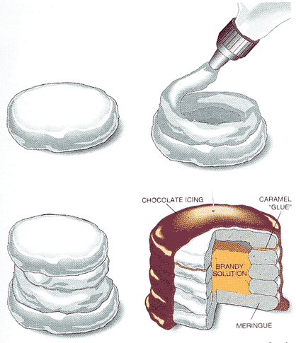 In the main article, we mention how we quantitatively determined the best way to produce a soufflé. Remarks made at a workshop in Erice, Sicily, indicated that it was not essential to put a soufflé in the oven immediately after folding in the whisked egg whites. It may be left for an hour or so in a hot water bath (a bain-marie, or double boiler) at 40 degrees Celsius (104 degrees Fahrenheit). Moreover, individual soufflé mixtures can be deep-frozen and thawed for cooking-a great help in catering a large dinner party or a banquet. You can test the hypotheses with individual cheese soufflés. The ingredients consist of 1/3 cup (75 grams) of butter (about 2/3 of a stick), about 2/3 cup (75 grams) of flour, 12/3 cups (400 milliliters) of milk, four egg yolks, four egg whites and about 1/2 cup (50 grams) of a grated cheese such as Gruyere. (Although we provide standard kitchen measures, we advocate the metric units for their greater precision.) Add salt, pepper and nutmeg to taste. The ingredients will fill five individual soufflé dishes that are about 10 centimeters in diameter and 6.5 centimeters high. Be sure the dishes have been buttered and coated with bread crumbs or flour. First, you need to make the bechamel sauce. Over medium heat, melt the butter in a saucepan, then stir in the flour. Under the microscope, the starch granules in the flour paste will appear tightly packed. Add hot milk to the sauce pan (starch molecules do not dissolve readily in cold milk). Stir until the mixture reaches a thick, creamy consistency. You will see under a microscope that the starch granules have swollen considerably. The swelling is one of the reasons for the high viscosity of the bechamel sauce: the granules cannot move freely. Another reason is that the starch liberates long polymers made of glucose, which help to create a gel structure. The polymers, which are too small to be seen under the microscope, are amylose (linear chains) and amylopectin (branched chains). Remove the pan from the heat, and stir in the cheese. When the mixture has cooled to 50 degrees C (the sauce should feel tolerably hot to the touch) add the egg yolks. You may add the yolks singly in one experiment, in twos in another and the four of them together in a third to see whether it makes any difference, as some cookbooks state. Whisk the egg whites in a clean bowl until the foam is stiff (it should be able to support a whole egg). If you examine the foam under the microscope from time to time, you will see that the air bubbles introduced by whipping become smaller and more numerous as the foam thickens. Surface tension explains why smaller bubbles produce a more stable foam. This force, which is the same as that which creates the meniscus at the surface of a glass of water, draws air bubbles firmly against one another and prevents the water from draining out of the bubble walls. In the long run, gravity will eventually destabilize the whisked egg whites.
