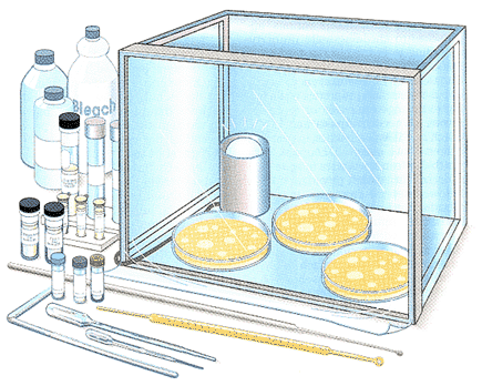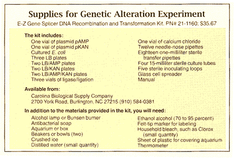 Because E. coli is already present in your gut, there is little to worry about. But remember to adhere to the sterile procedures described. They will ensure that you do not inadvertently ingest the stuff-and that it is E. coli, and not something else, that is blossoming on your petri dishes. The essential trick to manipulating E. coli genetically is to get the creature's single cell to think that a foreign gene is one of its own. In this case, we will graft the penicillin-resistance gene onto a plasmid from E. coli Plastids are circular loops of DNA that exist in cells independently of chromosomes. After being altered, the plasmids are able to reenter the cell and thus help us sneak our gene into the bacterium. They then replicate within the cell and produce proteins, including the ones that will bring about our desired trait. Furthermore, plasmids are propagated through successive generations. Thus, the gene is transmitted to all offspring, conferring its resistant properties to the entire colony of E. coli grown from the altered individuals. In this experiment, we will construct three types of recombinant plasmids, called pAMP, pKAN and pAMP/pKAN, by a process called ligation. By injecting these into E. coli, we will confer resistance for ampicillin (pAMP), for kana mycin (pKAN) or for both ampicillin and kanamycin (pAMP/pKAN) to the bacterium. To see the results of our engineering, we will then grow colonies of genetically altered E. coli on plates treated with ampicillin and kanamycin. For the materials needed in this experiment, I suggest purchasing a DNA recombination kit. In addition, you will need an aquarium (or some container of similar volume), a Bunsen burner and a few odds and ends listed in the box in Figure 2. First, we need to build an incubator in which to grow our E. coli colonies. A 20-gallon glass aquarium will do nicely; if you do not have one, use any container of the same volume, such as a cardboard box. Place the aquarium on its side with the open end facing you. Tape a piece of plastic to the top of the aquarium so that it drapes down, covering the open end. You will need to lift the plastic up and out of the way to work inside the aquarium.