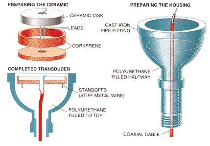 The basis for the transducer design is a piece of piezoelectric ceramic. When squeezed, this substance develops an electrical voltage across its ends. Conversely, applying a charge to the faces makes the material flex. An alternating voltage causes the ceramic to expand and contract in succession, yielding an acoustic wave. Acoustic waves likewise cause an alternating charge to develop across the faces of the ceramic. Measuring the characteristics of the voltage indicates the kind of object from which the sound waves are reflecting. The ceramic used for this construction is Navy type-I lead zirconate titanate or Vernitron type PZT-4. It can be obtained in several forms from various manufacturers. I got mine from EDO Acoustics (Ceramics Group, 2645 South 300 West, Salt Lake City, UT 841 15; telephone: 801-486-2115). You will need a ring of the material that is half an inch thick. A ring breaks up unwanted vibration patterns that exist radially through the disk and that compromise its performance. The disk should have a two-inch outside diameter and a 3/g-inch inside diameter. It is probably best to order the piece as a ring, as drilling holes through ceramic is not a trivial process. I had to send mine out, and it cost me $25. Make sure you purchase a ceramic that is polarized through its thickness and has both faces silvered. Building the transducer means connecting a couple of wire leads to the ceramic disk and then mounting it in a suitable housing. Cast-iron pipe fittings, available from hardware or plumbing supply stores for about $5, make a good container. I used a pipe two and a half inches long and half an inch in diameter and a pipe converter. The converter is just a piece of tubing wider on one end than it is on the other. The tail end of the pipe converter should be half an inch wide so that the other pipe can screw into it. The mouth should be just wide enough to accept the ceramic. I used one whose mouth end was two inches wide, but I had to machine the threads out to give myself room to work. File smooth the top surface of the pipe converter and connect the pipe to the tail of the converter [below right]. Next, prepare the ceramic for mounting. Begin by soldering a short lead to each face of the disk. To further suppress unwanted vibrations in the ceramic, you will need some Corkprene, a pliable, corklike material (made by Armstrong World Industries in Lancaster, Pa.; grade number DC-100). I received a three-foot-square, 1/16-inchthick sheet courtesy of Expanco Cork Company (P.O. Box 384, 1139 Phoenixville Pike, West Chester, PA 19380; telephone: 610-436-8300). Wrap the perimeter of the ceramic with the Corkprene and attach two additional layers to the back face of the disk. To connect the Corkprene to the ceramic, use Pliobond, an adhesive available at hardware stores. With the leads and cork in place, the ceramic is ready for mounting. Prepare the housing by threading some coaxial cable up through the narrow end of the pipe assembly. The cable should extend at least 20 feet. Pull it through so that about an inch sticks out of the top of the housing. Secure the cable in place by wrapping the narrow end of the housing with heavy tape. A tight seal is important. The next step is to fill the bottom half of the housing with a polyurethane potting compound. I used Conap EN-4 polyurethane (Conap, 1405 Buffalo Street, Olean, NY 14760; telephone: 716-3729650). Follow the package instructions in preparing the compound. Pour enough to fill the mouth end of the pipe converter halfway, but be sure to leave enough room for the ceramic and Corkprene. After the polyurethane sets (about 24 hours), trim the coaxial cable as closely as possible to the polyurethane. Cut the cable so that the center conductor and shield are visible (be sure they do not touch each other). Insert three or four pieces of short, stiff wire into the dried polyurethane. Cut pieces from sewing needles will work. These pieces hold up the ceramic disk and allow polyurethane to flow under it. Place them so that the ceramic will sit level to the front of the housing, about 1/8 inch below the lip. Solder one of the leads to the center conductor of the coaxial cable and the other to the cable's metal shield. Place the ceramic on the stiff wire pieces and pour in polyurethane all the way up to the brim of the pipe converter. (The polyurethane will not affect the function of the ceramic.) For best results, pour slowly and try to prevent any air bubbles from forming, especially on the front face of the transducer. Allow it to set for 48 hours.