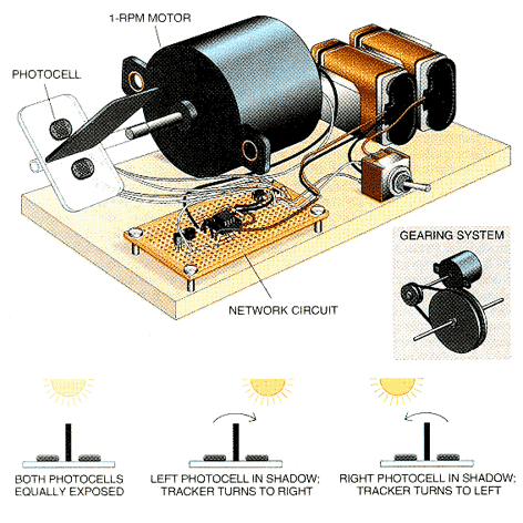 The motor is a low-voltage, direct-current type. The one I used was a 1 2-volt, one-revolution-per-minute (RPM) type. If your motor's RPM is too high, you will need to couple a large gear to it to reduce the speed [see Figure 1]. The motor should have a shaft about six centimeters long. To extend mine, I inserted a stiff plastic tube over the end of the motor shaft. To train the circuit, expose both photocells to equal levels of light. A lamp placed directly above the sensors should suffice. Adjust the potentiometer until the motor stops. This process alters the weight of the signal, so that when both photosensors receive equal illumination, the op-amp generates no voltage. Under uneven lighting conditions, the output of the op-amp takes on either a positive voltage (activating the NPN transistor) or a negative voltage (triggering the PNP transistor). The particular transistor activated depends on which sensor receives the least amount of light. To test the circuit, cover one photocell; the motor should begin rotating. R should stop once you remove the cover. Then block the other photocell. The motor should begin rotating in the opposite direction. Now glue the photosensor assembly to the shaft of the motor so that the photocells face up. Illuminate the sensors from an angle. If the motor rotates in the wrong direction (that is, away from the light), reverse the power wires to the motor. You may have to cut down on the amount of light reaching the photocells; full sun will easily saturate the sensors. Just cover the photocells with a colored, translucent piece of plastic. As long as the sun is directly aligned with the two photocells, exposing them to equal amounts of light, the inputs to the neuron balance out. As the sun moves across the sky, the alignment is thrown off, making one input stronger than the other. The op-amp neuron activates the motor, realigning the photocells. Notice that this neural circuit tracks a light source without relying on any equations or programming code. The circuit has immediate practical applications in the field of solar energy. For example, it can be hooked up to solar-powered cells, furnaces or water heaters to obtain the maximum amount of light input. You can also modify the device in a number of ways. For instance, you can hook up a second network so that you can track a light source that moves vertically as well as horizontally. ambitious amateurs might try replacing the photocells with other types of sensors, such as radio antennae. Then you can track radio-emitting satellites across the sky. Photocells sensitive to infrared energy could be used to track heat sources-the basis for some types of military targeting. Plenty of other modifications are possible, but don't expect your neuron ever to achieve consciousness. More intricate examples of the circuit described in the article demand fairly complicated hard-wiring. Complex variations are therefore perhaps best constructed as software. I wrote a program in BASIC that emulates an early neural network-the Perceptron, created in 1957 by Frank Rosenblatt of Cornell University. The Perceptron learns to identify shapes and letters. This software, as well as a few other artificial neural network programs, is available on an IBMcompatible disk for $9.95, plus $5.00 for postage and handling, from Images Company, R O. Box 140742, Staten Island, NY 10314, (718) 698-8305. Bibliography THE THREE-POUND UNIVERSE. Judith Hooper and Dick Teresi. Macmillan Publishing, 1986. FOUNDATIONS OF NEURAL NETWORKS MONDO PRIMER. Tarun Khanna. Addison-Wesley Publishing, 1990. NEUROCOMPUTING: THE TECHNOLOGY OF NON-ALGORITHMIC INFORMATION PROCESSING. Robert Hecht-Nielsen. Addison-Wesley Publishing, 1990. Suppliers and Organizations The Society for Amateur Scientists (SAS) is a nonprofit research and educational organization dedicated to helping people enrich their lives by following their passion to take part in scientific adventures of all kinds. The Society for