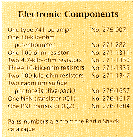 In an artificial neural network, objects called units represent the bodies of neurons. The units are connected by links, which replace the dendrites and axons The links adjust the output strength of the units, mimicking the different strengths of the connections between synapses, and transmit the signal to other units. Each unit, like a real neuron, fires only if all the input signals routed to it exceed some threshold value. The primary advantage of such an architecture is that the network can learn. Specifically, it can adjust the strength, or weight, of the links between units. In so doing, the links modify the output from one unit before feeding the signal to the next unit. Some links get stronger; others become weaker. To teach a network, researchers present so-called training patterns to the program, which modify the weight of the links. In effect, the training alters the firing pattern of the network [see "How Neural Networks Learn from Experience," by Geoffrey E. Hinton; SCIENTIFIC AMERICAN, September 1992]. A description of a homemade neural network program has appeared in these pages before [see "The Amateur Scientist," September 1992]. What I describe here is the construction of a simple, hard-wired neural network. Using a motor, this circuit follows the motion of a light source (such as the sun). All the parts are readily available from electronic hobby shops such as Radio Shack. The operation of the circuit is simple, particularly because it relies on only one neuron. The neuron is a type 741 operational amplifier (op-amp), a common integrated circuit. Be sure the op-amp comes with a pin diagram, which identifies the connection points on the op-amp by number. Two cadmium sulfide photocells act as neural sensors, providing input to the op-amp. The resistance of these components, which are about the size of the hp of your little finger, changes in proportion to the intensity of light. With epoxy or rubber cement, glue the photocells a couple of centimeters apart on a thin, plastic board that is approximately three centimeters wide by five centimeters long. Then affix a similarly sized piece of plastic between the cells so that the assembly assumes an inverted T shape. This piece must be opaque; I painted mine black.