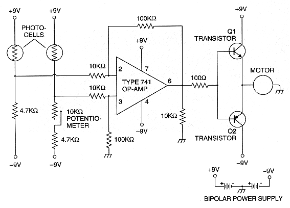 The rest of the circuit should be built on a stationary surface a few centimeters from the photosensor assembly. A breadboard-a perforated sheet of plastic that holds electronic components-will help keep the connections tidy. You will also need a power supply: a couple of nine-volt batteries will do the job. Connect the batteries together by wiring the positive terminal of one battery to the negative end of the other (in effect, grounding them). This configuration leaves open one terminal on each battery, thereby creating a bipolar power supply. Four components need to draw electricity: the two photocells, the op-amp and the motor. Connect these parts in parallel to the batteries. For convenience, you may wish to wire in an on-off switch. On the schematic [see illustration below], you will notice several resistors. They act to stabilize the amount of current that flows through the circuit. A 10-kilo-ohm potentiometer-basically, a variable resistor-is connected to one of the photocells. This component regulates the voltage received by the op-amp-that is, it adjusts the weight of the link. Hook up the photosensors so that they are connected to pin numbers 2 and 3 of the op-amp. The power supply goes to pins 4 and 7. The output signal leaves the op-amp at pin number 6 and travels to two transistors. One, labeled Q1 on the schematic, is a so-called NPN type; the other, Q2, is a PNP type. These transistors activate the motor and, in some sense, can be looked on as artificial motor neurons.