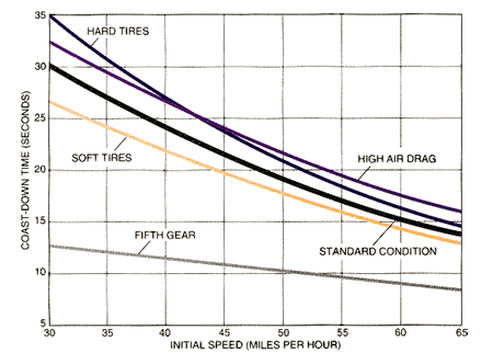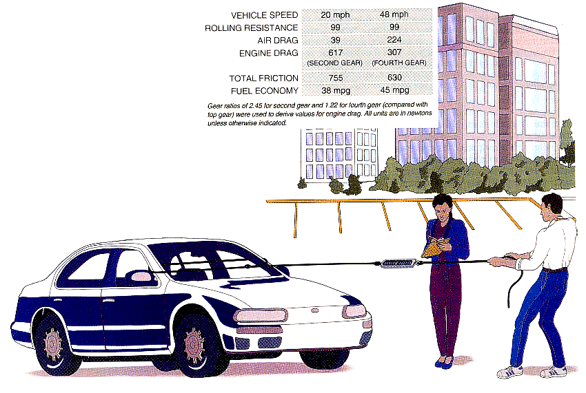 On level ground at constant speed, the engine of an automobile works against three kinds of friction: rolling resistance of the tires, friction within the engine, and air drag. These frictional sources largely determine a vehicle's energy use. Yet the coefficients representing these fuel-wasting forces are rarely published. With care, you can measure the friction and calculate the consequences for fuel economy. Most of the proposed measurements will work only on a manual transmission automobile. Also needed are some space in a parking area, a scale, a stopwatch, and a little-used, level and straight road way, half a mile or more in length. We did our experiments with a 1989 Honda Civic sedan. The first variable to measure is the coefficient of rolling resistance of the tires (represented by CR). The force needed to overcome this resistance is proportional to the car's weight and is roughly independent of its speed. To measure the resistance, place your vehicle in neutral on a smooth, level parking area with the engine off. Pull it horizontally with a rope looped through the windows and attached to a spring scale. A level affixed to the rope may help. Alternatively, push your car from behind with a bathroom scale (protect the vehicle with a heavy cloth). You should find a force roughly between 20 and 40 pounds. Our reading came in at about 25 pounds. Unfortunately, this measurement is crude. If either the parking surface or the scale is angled by 0.1 degree from the horizontal, it will change the measurement by five pounds for a typical 1,300-kilogram (3,000-pound) vehicle. It is also difficult to move the car at a steady speed, which is necessary to avoid inertial effects. A good idea is to have two people divide the tasks. One pulls, and the other reads the scale. To correct for grade, repeat the experiment in the reverse direction and average the results. To obtain the coefficient of rolling resistance, divide the measured force by the vehicle's weight, which is listed in the owner's manual. With properly inflated original equipment tires, the coefficient should roughly equal 1 percent. Aside from the effect of inflation pressure, several factors can confound the measurement of rolling resistance. One is bearing friction, which fortunately tends to be much smaller than tire resistance. Another is brake drag, which arises from the slight contact between the pads and rotors on the disk brakes. This contact may contribute one to two pounds of drag, amounting to about 5 percent of the rolling resistance. The coarseness of the road surface also affects rolling resistance; smooth, paved surfaces provide the greatest accuracy. Now measure the engine drag. The procedure is the same as that for rolling resistance, except that the transmission is in top gear. The scale reading provides the combined force of rolling resistance and engine drag. With our Honda Civic, we measured roughly 100 pounds, which means that engine drag is about three times greater than tire drag. (In typical driving, engine drag is somewhat less because depressing the accelerator opens the throttle slightly more than simple coasting does.) But the measurement is rough because the force is uneven as the cylinders go through their strokes. Deriving the coefficient that characterizes this friction is a bit complicated We must compare our measurements with the work performed by a "standard engine." By definition, a standard engine generates 100 joules of work to rotate the crankshaft once when the throttle is almost closed-that is, when the accelerator is up, in its rest position. The actual frictional work is then given as the product of 100 joules and the coefficient of engine friction, CE (a term coined for this column). To derive this coefficient, you need to know the volume swept through by the pistons (called engine displacement). This value, given in liters, is listed in the manual. You also need the number of revolutions the engine's crankshaft turns for every meter that the vehicle travels in top gear. We represent this number by n. One way to find n is to read off the revolutions per minute from the tachometer (if you have one) while driving in top gear. Divide this number by the vehicle speed in miles per hour, then further divide by 60 and by 0.447 meter per second (equal to one mile per hour). (A more involved method, ideal for people who enjoy number crunching, is to look up the overall gear ratio from the manual and use the tire circumference to calculate the distance the car moves and the number of crankshaft revolutions.) As a rough check on your results, note that vehicles are designed so that n varies from about 1 with large-displacement V-8 engines to almost 2 for small engines. In our experiment, we multiplied the measured net force of 75 pounds by 4.45, in order to convert pounds to newtons (the metric unit of force). For this car, n = 1.68 revolutions per meter, and the engine displacement is 1.5 liters. Thus, CE = 75 x 4.45/(100 x 1.68 x 1.5) = 1.3. The frictional work is therefore 130 joules per liter per revolution.