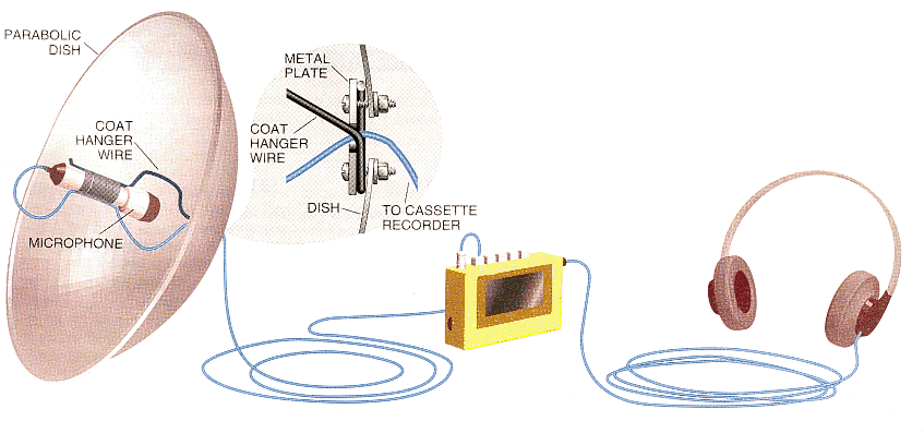 You might even be able to contribute them to a growing national registry. The Library of Natural Sounds at the Cornell Laboratory of Ornithology holds the world's largest collection of nature's voices. The archive contains songs from more than half of all bird species, not to mention insect chirps, amphibian croaks and mammal bleats. Contributing to this library of course demands high-performance devices, which can run into the thousands of dollars. Fortunately, discoveries can come more cheaply. With the help of some special software, you can do original research with a modest recording system. learn how to recognize animals by their calls. Read field guides, talk to naturalists and, most important, listen to recordings. The best resource for studying natural sounds is the Cornell library, but it charges a minimum of $22.50 for sounds. Fortunately, many collections of natural sounds are now compiled on CD. The Guide to Bird Sounds is the National Geographic Society's audio companion to its printed field guide, and the Peterson Field Guides offer calls from nearly every North American bird. If you have a CD-ROM player, check out Bird Song Master, which uses your computer to help you learn to identify birdcalls. Frog fans might try Voices of the Night, produced by the Cornell lab, which eavesdropped on lovesick amphibians. All these products can be purchased from the Library of Natural Sounds and other specialty retail outlets. Recording nature successfully demands that you be able to isolate one particular sound and screen out all the rest. A parabolic dish does this task quite well. With a microphone at its focus, it will collect only sounds that fall parallel to its center. The dish, however, must be small enough to be carried easily in the field, limiting its diameter to about one meter. To be reflected, a sound wave must fit inside the dish. Unfortunately, that means it will not amplify a sound wave longer than one meter. So the lowest pitch this dish will amplify is 344 hertz-roughly F above middle C. Luckily, most animals produce sounds above 344 hertz; for instance, birdcalls characteristically range from 2,000 to 6,000 hertz. Parabolic reflectors are not hard to come by. Edmund Scientific (telephone: 609-547-8880) carries an 18-inch-diameter, polished-aluminum reflector (No. 80254) for about $35. Radio dishes are also parabolic; a military surplus shop may have a few of the right size. And remember, any dish approximately parabolic will provide some amplification and directionality-some woks and large salad bowls work surprisingly well. You can also experiment with tightly stretched umbrellas, plastic snow-slides, decorative housings for light fixtures and even the bottom of a barbecue grill. Once you have a parabolic amplifier, you will need a microphone, a tape recorder and a set of headphones. Drill a hole at the base of the parabolic dish large enough to accommodate the microphone wire. A stiff metal-wire coat hanger makes a good support for the microphone. Coil up one end of the hanger wire at the base of the dish and bolt a metal plate on top of the coiled area to hold the wire to the dish [see illustration below]. With duct tape, secure the free end of the hanger wire to the microphone, which should face the dish You will have to experiment to find the best position for the microphone. The wire from the microphone can be hooked directly to a portable cassette recorder. The electronic equipment does not have to be fancy-you can learn a lot by stalking around with a $30 microphone and $50 tape machine. To gain real-world recording experience, practice at a zoo. Here animal sounds are plentiful and confined to small areas, and it is easy to recover from equipment mishaps. When in the wild, be aware of what is happening behind your target. Like a telephoto lens, a parabolic microphone will compress the distance between foreground and background. Noises coming from behind your target will sound louder on the recording than they did to your ear. So position yourself to aim either upward or downward at your target. Then your background will be only the quiet sky or ground. A few years ago only professionals could dissect sounds. Today you just need a little software. Canary, a Macintosh program designed at the Cornell ornithology lab, is ideal for studying natural voices. It lets you instantly see how any tone is constructed [see illustration at right]. Canary lets you zero in on any part of the melody and analyze it in detail. The program also helps to hide sins committed in the field: unwanted sounds, like distant rumblings from a truck, can be deleted. But it is Canary's ability to compare different sounds that makes it so powerful. Canary tests sounds mathematically to see how alike they are. For identical sounds, the result is 1; for completely different ones, the result is 0. The program shifts one melody past the other in time and compares them. Then it plots these numbers so you can observe the difference graphically. This feature makes all kinds of explorations possible. You can measure the difference between two consecutive calls from the same bird, compare one bird's song with that of another from 5 the same species and test your ideas about the notes from closely related species. With a bit of cleverness, you can measure the time delay between when -the sound arrives at each of three widely separated microphones and hence locate the bird's position when it called. (Sound travels about 344 meters per second and arrives first at the microphone closest to the animal.) You could piece together an individual bird's movements and determine the boundaries of its territory. Or try mapping the search pattern of a hunting bat by its sonar- the possibilities are endless. Given its power, Canary is a bargain at $250. If a Windows or DOS machine lives on your desk, consider Wave for Windows (Turtle Beach, $149), Sound Forge (Sonic Foundry, $495) or Software Audio Workshop (Innovat