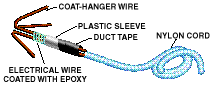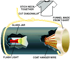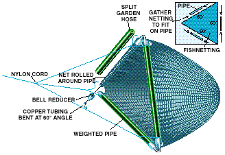 Like moths to flame, some inhabitants of the murky depths are attracted to light. You can catch many of these critters using the light-baited trap shown above. A flashlight is safely housed inside a sealed glass jar and placed within a simple trap. The funnel opening guides creatures in. Once inside, they have little chance of finding their way out again. I've used wastebaskets and large-diameter aluminum pipes for the trap's main chamber. You can fashion the funnel out of an old white T-shirt and coat-hanger wire. Situate the flashlight to illuminate the cloth opening. Put the trap in the pond before sunset and hoist it up later that evening to examine your catch. As a variation, try building a circuit that flashes the light. Plans appear in Getting Started in Electronics, by Forrest M. Mims III (Radio Shack, $4.99). I've always wanted to build such a circuit to see which species come calling when lured by a pulsating invitation, but I haven't managed to get toit. You can also experiment with different pulse frequencies. Let me know what you find. A homemade grappling hook is invaluable for snagging aquatic plants. The tines can be fashioned from coat-hanger wire. Use insulated electrical wire to lash the tines to the end of some nylon cord. Next, saturate the electrical-wire wrappings with a generous layer of epoxy and let it set. Wrap the assembly with duct tape and slide a narrow piece of plastic pipe over it for protection. Finally, seal out debris by filling the pipe with epoxy. Deploy the grapple by swinging it around your head and letting it fly into a shallow of water plants. Then pull the plants toward you. You might also find some interesting guests on the fronds and stems.