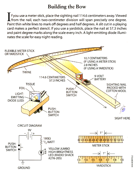 If a trek to subarctic Siberia doesn't fit your plans, don't worry. Hale-Bopp promises sensational views from anywhere on the planet. It also offers amateurs a chance to contribute to cometary research: the Harvard-Smithsonian Center for Astrophysics in Cambridge, Mass., is coordinating a global net of observers, and anyone can participate. Astronomers are agog over Hale-Bopp because its nucleus seems particularly active. A cometary nucleus is a fluffy ball of ice and rock whose surface evaporates as the wanderer nears the sun. The resulting streams of dust and gas make up the comet's tails. (The glowing dust traces a curved path; ionized gas travels in a straight line away from the sun.) Hale-Bopp's nucleus first began spurting out visible jets of debris as it passed the orbit of Jupiter, roughly seven astronomical units from the sun (1 AU is the average distance from the sun to the earth, or about 150 million kilometers). Experienced naked-eye observers have been watching Hale-Bopp since May 1996 (most comets are visible to the unaided eye only a few months before perihelion), and the rest of us should be able to see it starting this month. A comet's tails (one dust, the other gas) reveal some of its most intimate secrets of composition and structure. They also give earthbound watchers a fine traveling laboratory to chart the solar wind. Tails are sometimes decorated with feathery features that flow outward under the solar wind's influence. Comet Kohoutek delighted astronomers in 1974 with at least two prominent examples of these skirting disturbances. Any amateur can record these and other features of the comet's tails. First, you'll need a good star atlas that maps stars in terms of right ascension and declination. (Norton's 2000.0 Star Atlas and Reference Handbook, 18th edition, by Ian Ridpath, is probably best for this purpose.) You'll also need a drafting compass and a large bow-shaped angular scale. The bow, made from a flexible meter stick or yardstick and a long piece of scrap wood, will let you locate the tails' features to about 0.1 degree of arc. Sketch the tails directly on the appropriate page of the star atlas (or on a good photocopy). Locate the comet's head by measuring the angular separation between the head and the three nearest stars in the atlas. Celestial maps mark the positions of stars in terms of declination and right ascension; to convert from angles to distance on the page, note that one hour of right ascension equals 15 degrees at the celestial equator. Elsewhere in the sky, divide the distance at the equator by the cosine of the declination. For each measurement, set the compass to the appropriate opening and scribe a small arc through where you expect the head to be. The precise location of the head is where the arcs intersect. Follow the same procedure to mark all the other major features in the tails and then fill in the finer details. Use a telescope or binoculars for this part. By carrying out this procedure every clear night, you can document the evolution of the tails. The comet's fuzzy head, or coma, also changes over time in size, brightness and degree of condensation. The best way to measure its size is to use an eyepiece with a calibrated scale etched into the lens. They're a bit pricey, but for accuracy they can't be beat. Check out the micro guide eyepiece from Celestron in Torrance, Calif.; call (800) 237-0600 or (310) 328-9560 to find a local dealer-mine sells the eyepiece for $189.